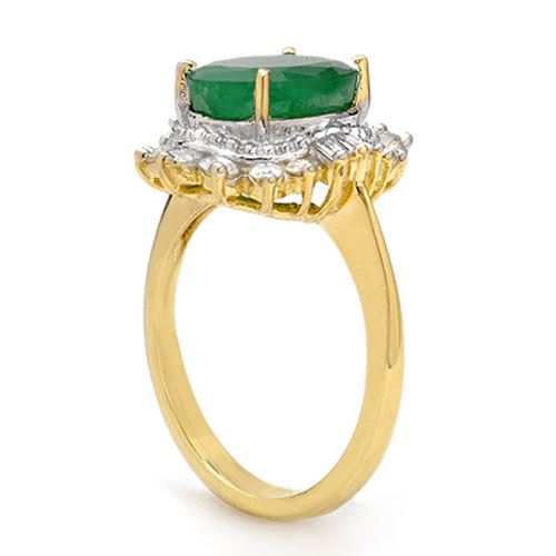 REF-100M2H -13174 ---- 4.85 CTW Emerald & Diamond Ring 14K Yellow Gold ---- Luxury Designer Brand Ring Appraised at $6,600 Certificate Number US13174 14k Yellow gold, Ring Size is 6.75, Ring measuring approx. 5/8" x 5/8" , weighing in total approx. 4.3 grams. Made in the USA and is stamped 14k, Main stone 4.1 carat total weight containing 1 pieces of Intense Green color with AAA quality Oval shape cut Emerald , Stone #2 0.75 carat total weight containing 20 pieces of H-I color with VS/SI quality Round shape cut Diamond