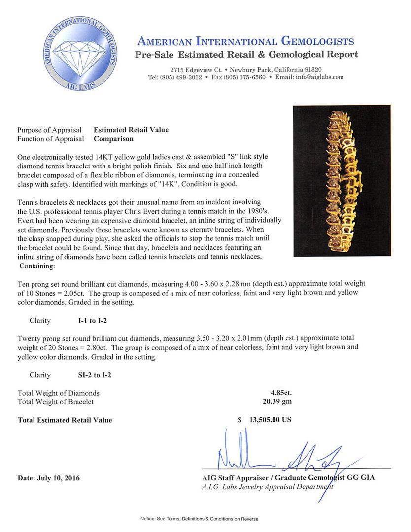 One electronically tested 14KT yellow gold ladies cast & assembled 'S' link style diamond tennis bracelet with a bright polish finish. Six and one-half inch length bracelet composed of a flexible ribbon of diamonds, terminating in a concealed clasp with safety. Identified with markings of '14K'. Condition is good. Tennis bracelets & necklaces got their unusual name from an incident involving the U.S. professional tennis player Chris Evert during a tennis match in the 1980's. Evert had been wearing an expensive diamond bracelet, an inline string of individually set diamonds. Previously these bracelets were known as eternity bracelets. When the clasp snapped during play, she asked the officials to stop the tennis match until the bracelet could be found. Since that day, bracelets and necklaces featuring an inline string of diamonds have been called tennis bracelets and tennis necklaces. Containing: Ten prong set round brilliant cut diamonds, measuring 4.00 - 3.60 x 2.28mm (depth est.) approximate total weight of 10 Stones = 2.05ct. The group is composed of a mix of near colorless, faint and very light brown and yellow color diamonds. Graded in the setting. Clarity I-1 to I-2 Twenty prong set round brilliant cut diamonds, measuring 3.50 - 3.20 x 2.01mm (depth est.) approximate total weight of 20 Stones = 2.80ct. The group is composed of a mix of near colorless, faint and very light brown and yellow color diamonds. Graded in the setting. Clarity SI-2 to I-2. Total Weight of Diamonds 4.85ct.. Total Weight of Bracelet 20.39gm. AIG Appraised at $13,505.00.