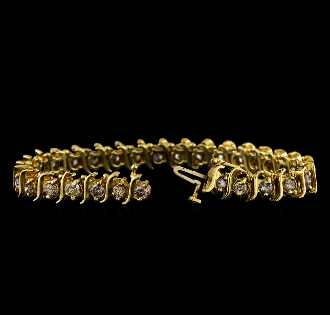 One electronically tested 14KT yellow gold ladies cast & assembled 'S' link style diamond tennis bracelet with a bright polish finish. Six and one-half inch length bracelet composed of a flexible ribbon of diamonds, terminating in a concealed clasp with safety. Identified with markings of '14K'. Condition is good. Tennis bracelets & necklaces got their unusual name from an incident involving the U.S. professional tennis player Chris Evert during a tennis match in the 1980's. Evert had been wearing an expensive diamond bracelet, an inline string of individually set diamonds. Previously these bracelets were known as eternity bracelets. When the clasp snapped during play, she asked the officials to stop the tennis match until the bracelet could be found. Since that day, bracelets and necklaces featuring an inline string of diamonds have been called tennis bracelets and tennis necklaces. Containing: Ten prong set round brilliant cut diamonds, measuring 4.00 - 3.60 x 2.28mm (depth est.) approximate total weight of 10 Stones = 2.05ct. The group is composed of a mix of near colorless, faint and very light brown and yellow color diamonds. Graded in the setting. Clarity I-1 to I-2 Twenty prong set round brilliant cut diamonds, measuring 3.50 - 3.20 x 2.01mm (depth est.) approximate total weight of 20 Stones = 2.80ct. The group is composed of a mix of near colorless, faint and very light brown and yellow color diamonds. Graded in the setting. Clarity SI-2 to I-2. Total Weight of Diamonds 4.85ct.. Total Weight of Bracelet 20.39gm. AIG Appraised at $13,505.00.
