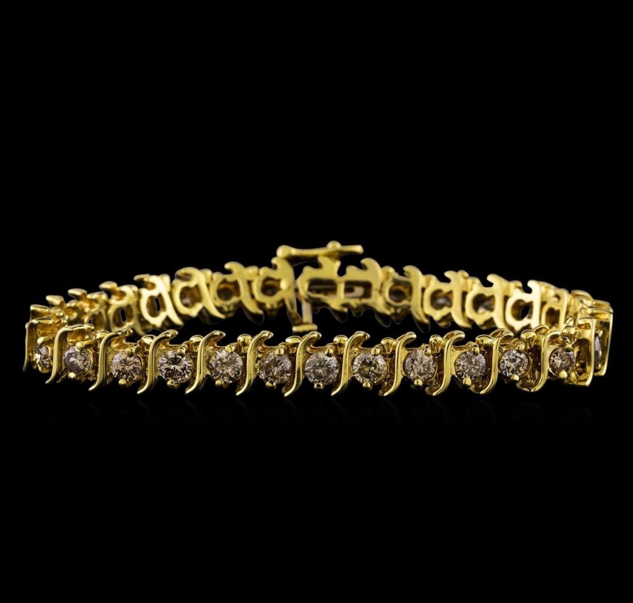 One electronically tested 14KT yellow gold ladies cast & assembled 'S' link style diamond tennis bracelet with a bright polish finish. Six and one-half inch length bracelet composed of a flexible ribbon of diamonds, terminating in a concealed clasp with safety. Identified with markings of '14K'. Condition is good. Tennis bracelets & necklaces got their unusual name from an incident involving the U.S. professional tennis player Chris Evert during a tennis match in the 1980's. Evert had been wearing an expensive diamond bracelet, an inline string of individually set diamonds. Previously these bracelets were known as eternity bracelets. When the clasp snapped during play, she asked the officials to stop the tennis match until the bracelet could be found. Since that day, bracelets and necklaces featuring an inline string of diamonds have been called tennis bracelets and tennis necklaces. Containing: Ten prong set round brilliant cut diamonds, measuring 4.00 - 3.60 x 2.28mm (depth est.) approximate total weight of 10 Stones = 2.05ct. The group is composed of a mix of near colorless, faint and very light brown and yellow color diamonds. Graded in the setting. Clarity I-1 to I-2 Twenty prong set round brilliant cut diamonds, measuring 3.50 - 3.20 x 2.01mm (depth est.) approximate total weight of 20 Stones = 2.80ct. The group is composed of a mix of near colorless, faint and very light brown and yellow color diamonds. Graded in the setting. Clarity SI-2 to I-2. Total Weight of Diamonds 4.85ct.. Total Weight of Bracelet 20.39gm. AIG Appraised.