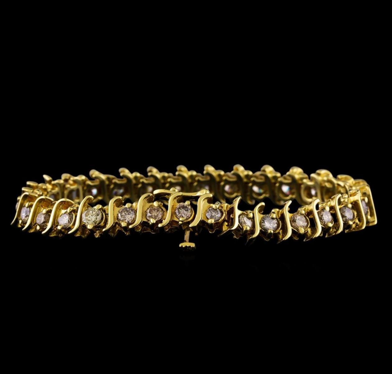 One electronically tested 14KT yellow gold ladies cast & assembled 'S' link style diamond tennis bracelet with a bright polish finish. Six and one-half inch length bracelet composed of a flexible ribbon of diamonds, terminating in a concealed clasp with safety. Identified with markings of '14K'. Condition is good. Tennis bracelets & necklaces got their unusual name from an incident involving the U.S. professional tennis player Chris Evert during a tennis match in the 1980's. Evert had been wearing an expensive diamond bracelet, an inline string of individually set diamonds. Previously these bracelets were known as eternity bracelets. When the clasp snapped during play, she asked the officials to stop the tennis match until the bracelet could be found. Since that day, bracelets and necklaces featuring an inline string of diamonds have been called tennis bracelets and tennis necklaces. Containing: Ten prong set round brilliant cut diamonds, measuring 4.00 - 3.60 x 2.28mm (depth est.) approximate total weight of 10 Stones = 2.05ct. The group is composed of a mix of near colorless, faint and very light brown and yellow color diamonds. Graded in the setting. Clarity I-1 to I-2 Twenty prong set round brilliant cut diamonds, measuring 3.50 - 3.20 x 2.01mm (depth est.) approximate total weight of 20 Stones = 2.80 ct. The group is composed of a mix of near colorless, faint and very light brown and yellow color diamonds. Graded in the setting. Clarity SI-2 to I-2. Total Weight of Diamonds 4.85ct.. Total Weight of Bracelet 20.39gm. AIG Appraised.
