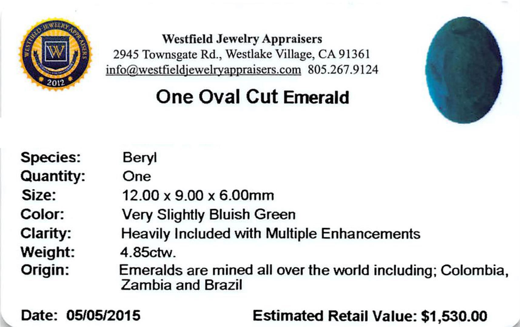 One oval mixed cut natural emerald, measuring 12.00 x 9.00 x 6.00mm, exact weight 4.85ct., clarity is heavily included, medium dark, very slightly grayish, very slightly greenish blue color, (GIA vslgB 6/3), cut is good. Indications of multiple laboratory enhancements, including high temperature heat treatment. Westfield Appraised at $1,530.00.
