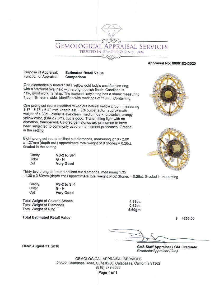 One electronically tested 18KT yellow gold lady's cast fashion ring with a starburst oval halo with a bright polish finish. The featured lady's ring has a shank measuring 1.35 millimeters wide. Identified with markings of '18K'. Condition is new, good workmanship. Containing: One prong set round modified mixed cut natural yellow zircon, measuring 8.87 - 8.75 x 5.42 mm, (depth est.) 5%. bulge factor, approximate weight of 4.33ct., clarity is eye clean, medium dark, brownish, orangy yellow color, (GIA oY 6/1), cut is good. Transmitting light with no distortion, transparent. Colored gemstones are presumed to have been subjected to commonly used enhancement processes. Graded in the setting. Eight prong set round brilliant cut diamonds, measuring 2.10 - 2.00 x 1.27mm (depth est.) approximate total weight of 8 Stones = 0.26ct. Graded in the setting. Color G - H Clarity VS-2 to SI-1 Cut Very Good Thirty-Two prong set round brilliant cut diamonds, measuring 1.35 - 1.30 x 0.80mm (depth est.) approximate total weight of 32 Stones = 0.26ct. Graded in the setting. Color G - H Clarity VS-2 to SI-1 Cut Very Good. Total Weight of Colored Stones 4.33ct.. Total Weight of Diamonds 0.52ct.. Total Weight of Ring 5.60gm GAS Appraised at $4255.00. GAS Appraised.