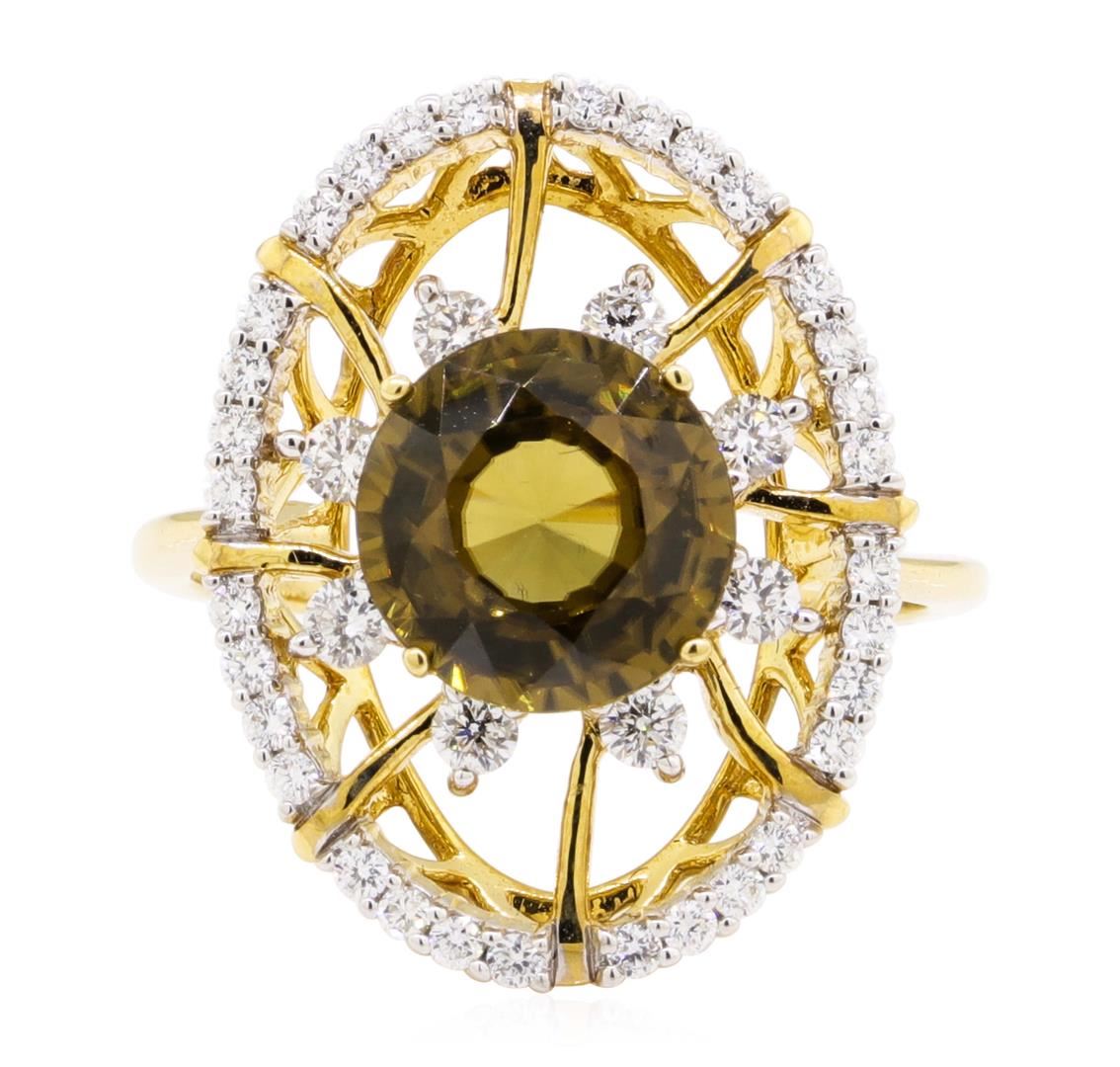 One electronically tested 18KT yellow gold lady's cast fashion ring with a starburst oval halo with a bright polish finish. The featured lady's ring has a shank measuring 1.35 millimeters wide. Identified with markings of '18K'. Condition is new, good workmanship. Containing: One prong set round modified mixed cut natural yellow zircon, measuring 8.87 - 8.75 x 5.42 mm, (depth est.) 5%. bulge factor, approximate weight of 4.33ct., clarity is eye clean, medium dark, brownish, orangy yellow color, (GIA oY 6/1), cut is good. Transmitting light with no distortion, transparent. Colored gemstones are presumed to have been subjected to commonly used enhancement processes. Graded in the setting. Eight prong set round brilliant cut diamonds, measuring 2.10 - 2.00 x 1.27mm (depth est.) approximate total weight of 8 Stones = 0.26ct. Graded in the setting. Color G - H Clarity VS-2 to SI-1 Cut Very Good Thirty-Two prong set round brilliant cut diamonds, measuring 1.35 - 1.30 x 0.80mm (depth est.) approximate total weight of 32 Stones = 0.26ct. Graded in the setting. Color G - H Clarity VS-2 to SI-1 Cut Very Good. Total Weight of Colored Stones 4.33ct.. Total Weight of Diamonds 0.52ct.. Total Weight of Ring 5.60gm GAS Appraised at $4255.00. GAS Appraised at $4,255.00.