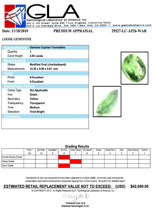 4.85ct Green Yellow Cuprian Tourmaline Appraised $43k (GEM-29527)
