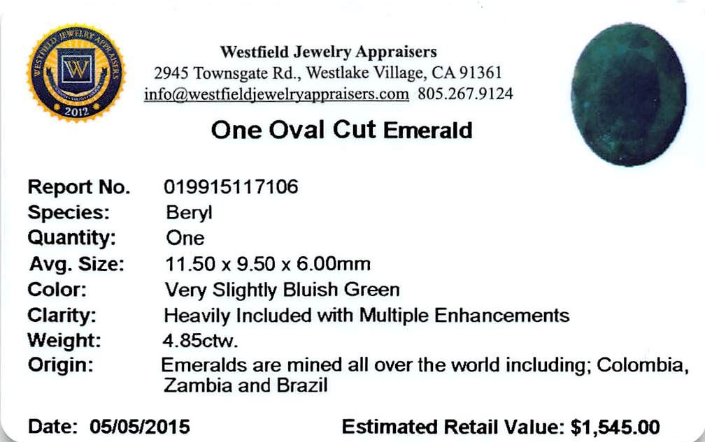 One oval mixed cut natural emerald, measuring 11.50 x 9.50 x 6.00mm, exact weight 4.85ct., clarity is heavily included, type III, medium dark, very slightly grayish, very slightly bluish green color, (GIA vslbG 6/3), cut is good. Westfield Appraised at $1,545.00.