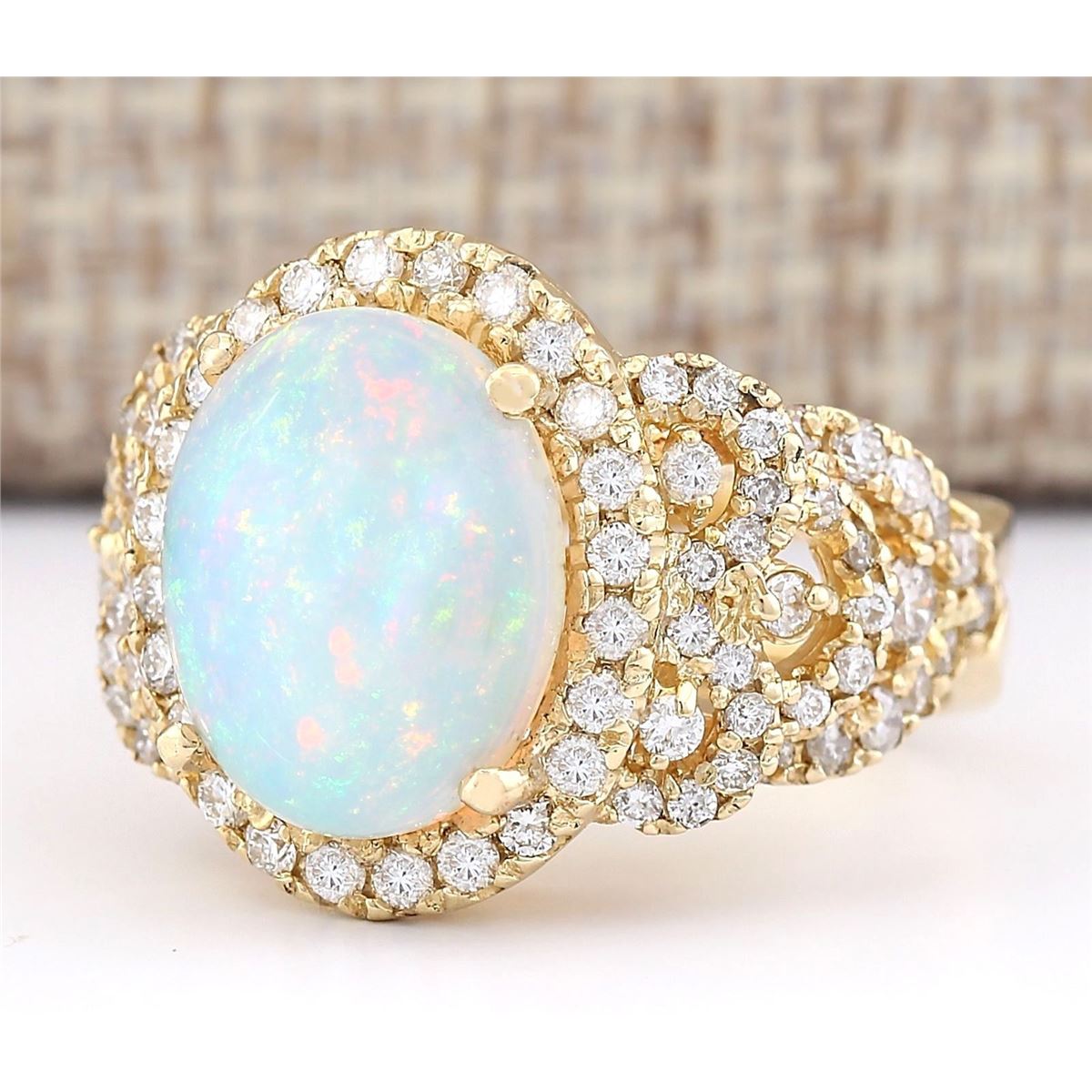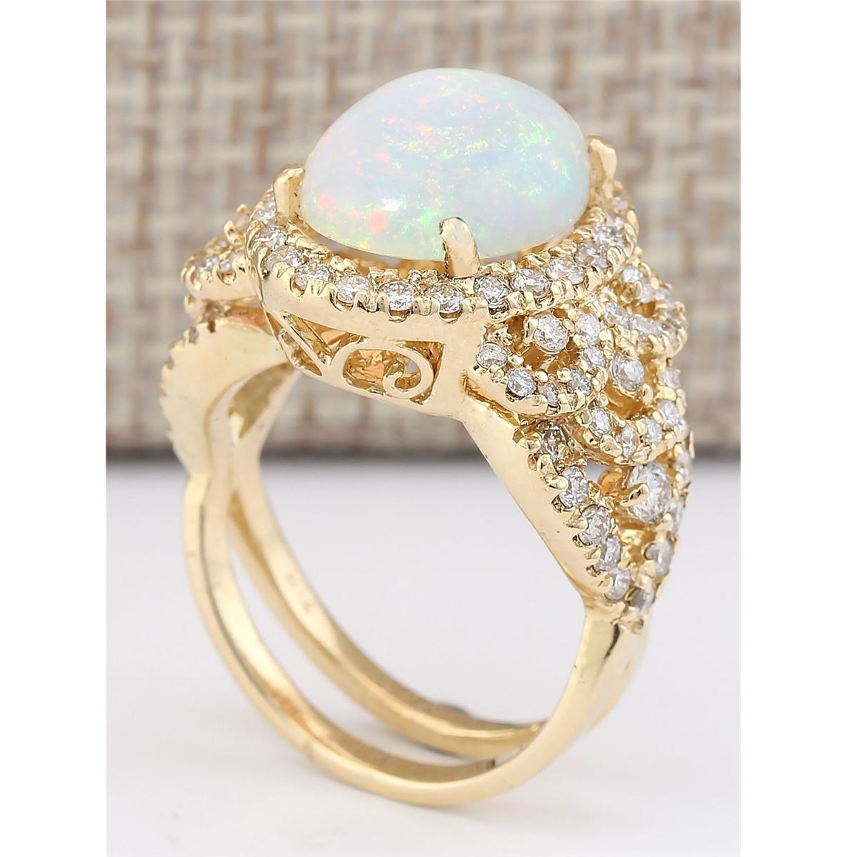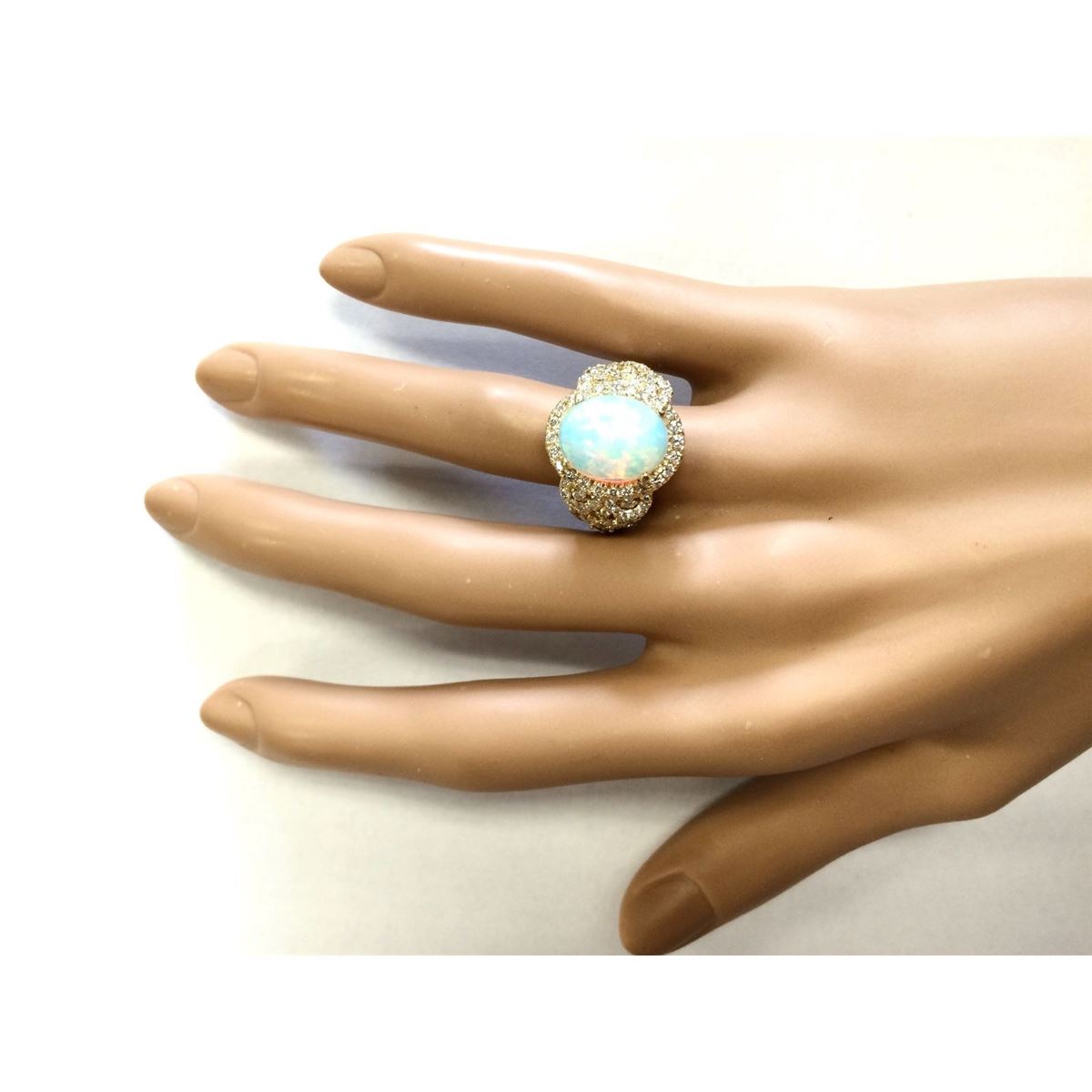 Stamped: 14K Ring Size: 7.5 Total Ring Weight: 10.4 Grams Diamond Weight: Total natural diamond weight is 1.50carat. SI1-SI2 clarity / G-H color Gemstone Weight: Total Natural Opal Weight is 3.36ctw (Measures: 13.23x10.45mm) Main Stone Color: Multi-Color Face Measures: 17.35x14.47mm SKU: [703920]
