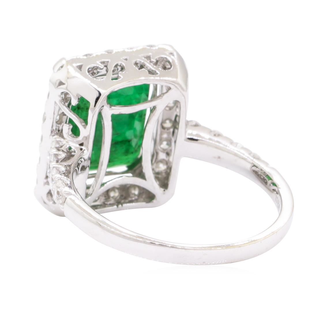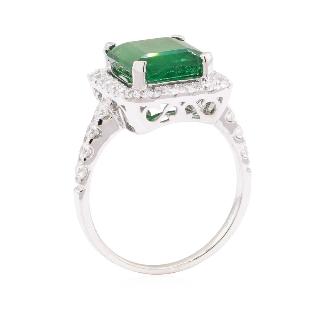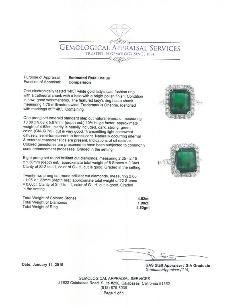 One electronically tested 14KT white gold lady's cast fashion ring with a cathedral shank with a halo with a bright polish finish. The featured lady's ring has a shank measuring 1.75 millimeters wide. Trademark is Orianne. Identified with markings of '14K'. Condition is new, good workmanship. Containing: One prong set emerald standard step cut natural emerald, measuring 10.89 x 9.03 x 5.67mm, (depth est.) 10%. bulge factor, approximate weight of 4.52ct., clarity is heavily included, dark, strong, green color, (GIA G 7/5), cut is very good. Transmitting light somewhat diffusely, semi-transparent to translucent. Naturally occurring internal & external characteristics are present. Indications of oil residue. Colored gemstones are presumed to have been subjected to commonly used enhancement processes. Graded in the setting. Eight prong set round brilliant cut diamonds, measuring 2.25 - 2.15 x 1.36mm (depth est.) approximate total weight of 8 Stones = 0.34ct. Graded in the setting. Color G - H Clarity SI-2 to I-1 Cut Good Twenty-Two prong set round brilliant cut diamonds, measuring 2.00 - 1.95 x 1.23mm (depth est.) approximate total weight of 22 Stones = 0.66ct. Graded in the setting. Color G - H Clarity SI-1 to I-1 Cut Good. Total Weight of Colored Stones 4.52ct.. Total Weight of Diamonds 1.00ct.. Total Weight of Ring 4.50gm GAS Appraised at $7530.00. GAS Appraised at $7,530.00.