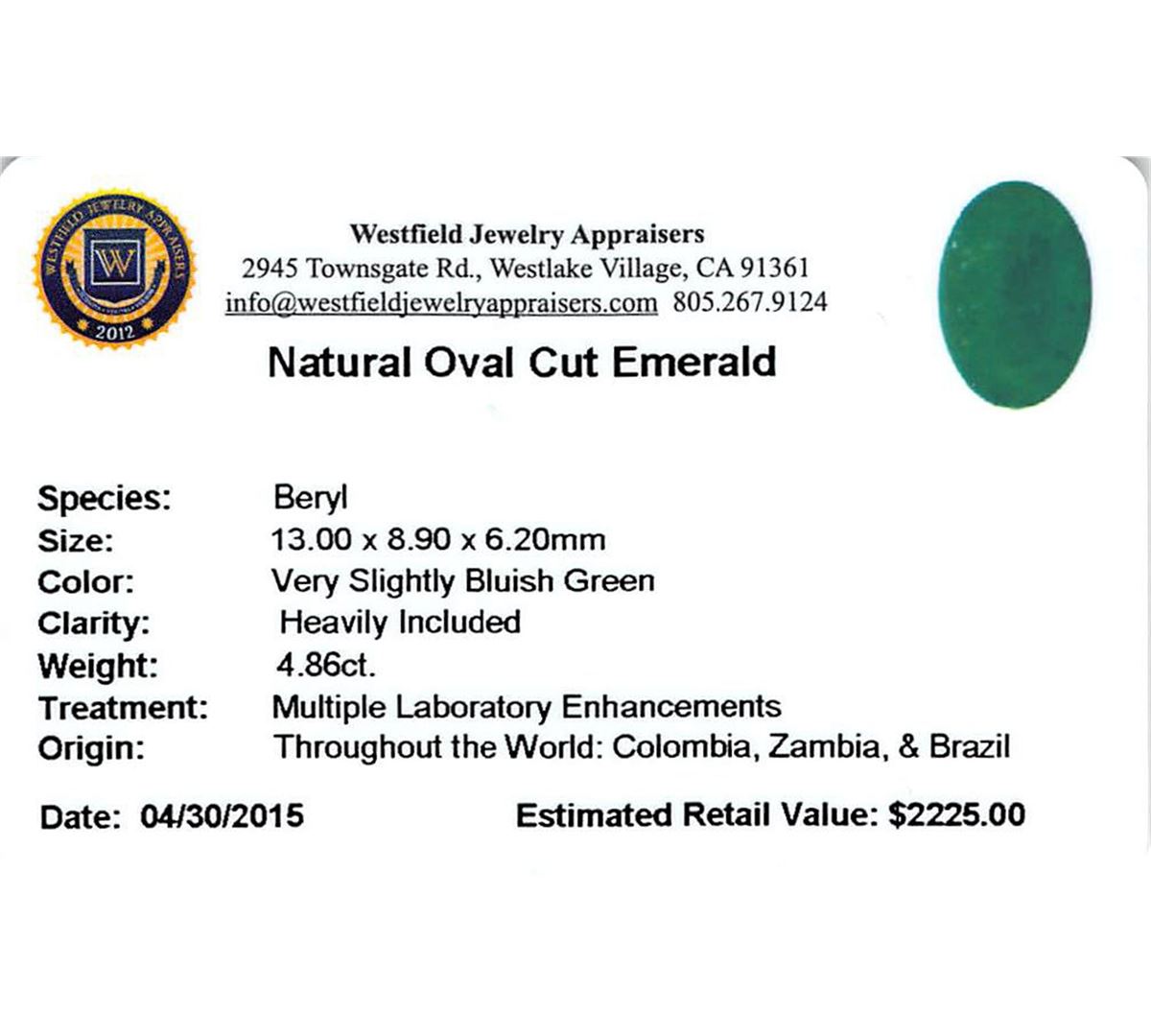 One oval cut natural emerald, measuring 13.00 x 8.90 x 6.20mm, exact weight 4.86ct., clarity is heavily included, type III, medium dark, very slightly grayish, very slightly bluish green color, (GIA vslbG 6/3) Westfield Appraised at $2,225.00.