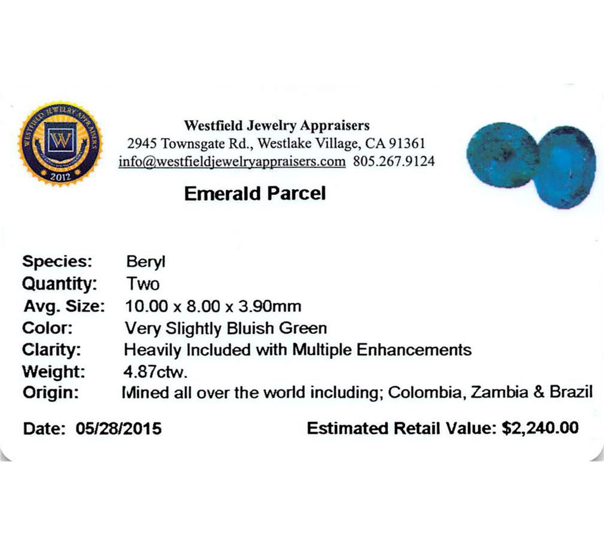 Two oval mixed cut natural emeralds, measuring 10.00 x 8.00 x 3.90mm, exact total weight 4.87ct., clarity is heavily included, type III, medium dark, very slightly grayish, very slightly bluish green color, (GIA vslbG 6/3), cut is good. Transmitting light somewhat diffusely, translucent, Naturally occurring internal & external characteristics are present, Indications of multiple laboratory enhancements, including high temperature heat treatment. Westfield Appraised at $2,240.00.