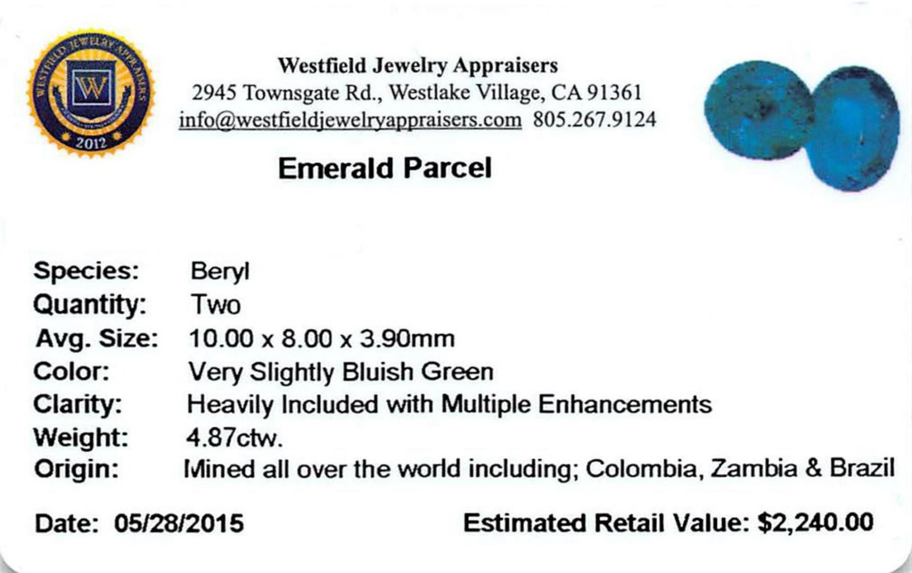 Two oval mixed cut natural emeralds, measuring 10.00 x 8.00 x 3.90mm, exact total weight 4.87ct., clarity is heavily included, type III, medium dark, very slightly grayish, very slightly bluish green color, (GIA vslbG 6/3), cut is good. Transmitting light somewhat diffusely, translucent, Naturally occurring internal & external characteristics are present, Indications of multiple laboratory enhancements, including high temperature heat treatment. Westfield Appraised.