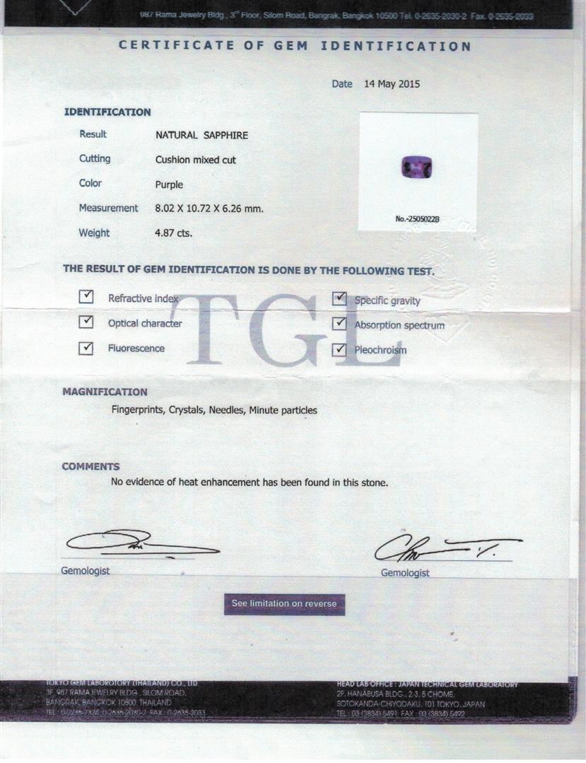 One electronically tested 14KT yellow and white gold lady's combination cast & assembled fashion ring with a tapered shank with halo with a bright polish with milgrain detailing finish. The featured lady's ring has a shank measuring 5.60 millimeters wide. Identified with markings of '14K'. Condition is new, good workmanship. Containing: One prong set rectangular cushion modified mixed cut natural purple sapphire, measuring 10.72 x 8.02 x 6.26mm, (depth est.) approximate weight of 4.87ct., clarity is slightly included, medium, moderately strong, purple color, (GIA P 5/4), cut is very good. Transmitting light with a minimum of distortion, transparent. No indications of heat treatment. Colored gemstones are presumed to have been subjected to commonly used enhancement processes. Graded loose prior to setting in the TGL Laboratory, Report #25050228. Sixteen prong set round brilliant cut diamonds, measuring 2.20 - 2.10 x 1.33mm (depth est.) approximate total weight of 16 Stones = 0.63ct. Graded in the setting. Clarity VS-1 to SI-1. Color: F - G Cut Very Good Twenty-Two bead set round brilliant cut diamonds, measuring 1.60 - 1.50 x 0.96mm (depth est.) approximate total weight of 22 Stones = 0.31ct. Graded in the setting. Clarity VS-2 to SI-1. Color: G - H Cut Very Good. Total Weight of Colored Stones 4.87ct.. Total Weight of Diamonds 0.94ct.. Total Weight of Ring 11.30gm GAS Appraised at $21,635.00.