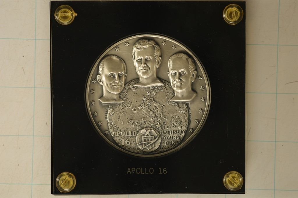 MEDALLIC ART COMPANY, EDGE MARKED IN HARD PLASTIC CASE. THE OBVERSE HAS: MATTINGLY, YOUNG AND DUKE ON IT AND THE REVERSE HAS: DESCARTES APRIL 16-27, 1972 (71 HOURS) ALL IN ANTIQUE FINISH, HIGH RELIEF. IT IS 2.5" IN