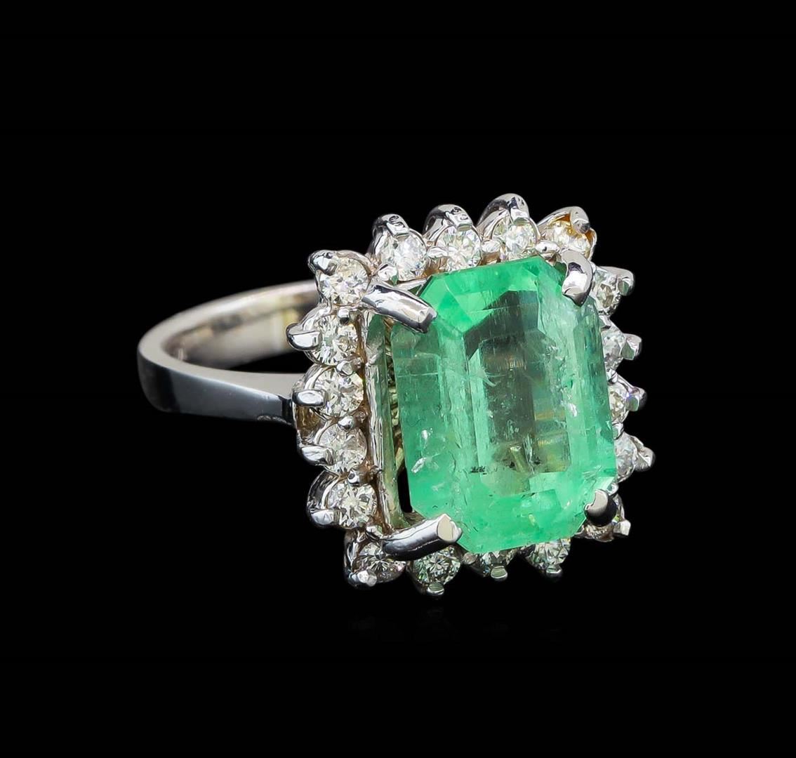 One electronically tested 14KT white gold lady's cast fashion ring with a basket halo with a bright polish finish. The featured lady's ring has a shank measuring 2.77 millimeters wide. Identified with markings of '14K'. Condition is new, good workmanship. Containing: One prong set emerald step cut natural emerald, measuring 11.55 x 9.01 x 6.56mm, (depth est.) approximate weight of 4.88ct., clarity is moderately included, medium light, moderately strong, green color, (GIA G 4/4), cut is good. Transmitting light somewhat diffusely, transparent to translucent. Naturally occurring internal & external characteristics are present. Indications of oil residue. Colored gemstones are presumed to have been subjected to commonly used enhancement processes. Graded in the setting. Eighteen prong set round brilliant cut diamonds, measuring 2.10 - 2.00 x 1.27mm (depth est.) approximate total weight of 18 Stones = 0.60ct. Graded in the setting. Clarity SI-1 to SI-2. Color: H - I Cut Good. Total Weight of Colored Stones 4.88ct.. Total Weight of Diamonds 0.60ct.. Total Weight of Ring 6.40gm. GAS Appraised at $9,195.00.