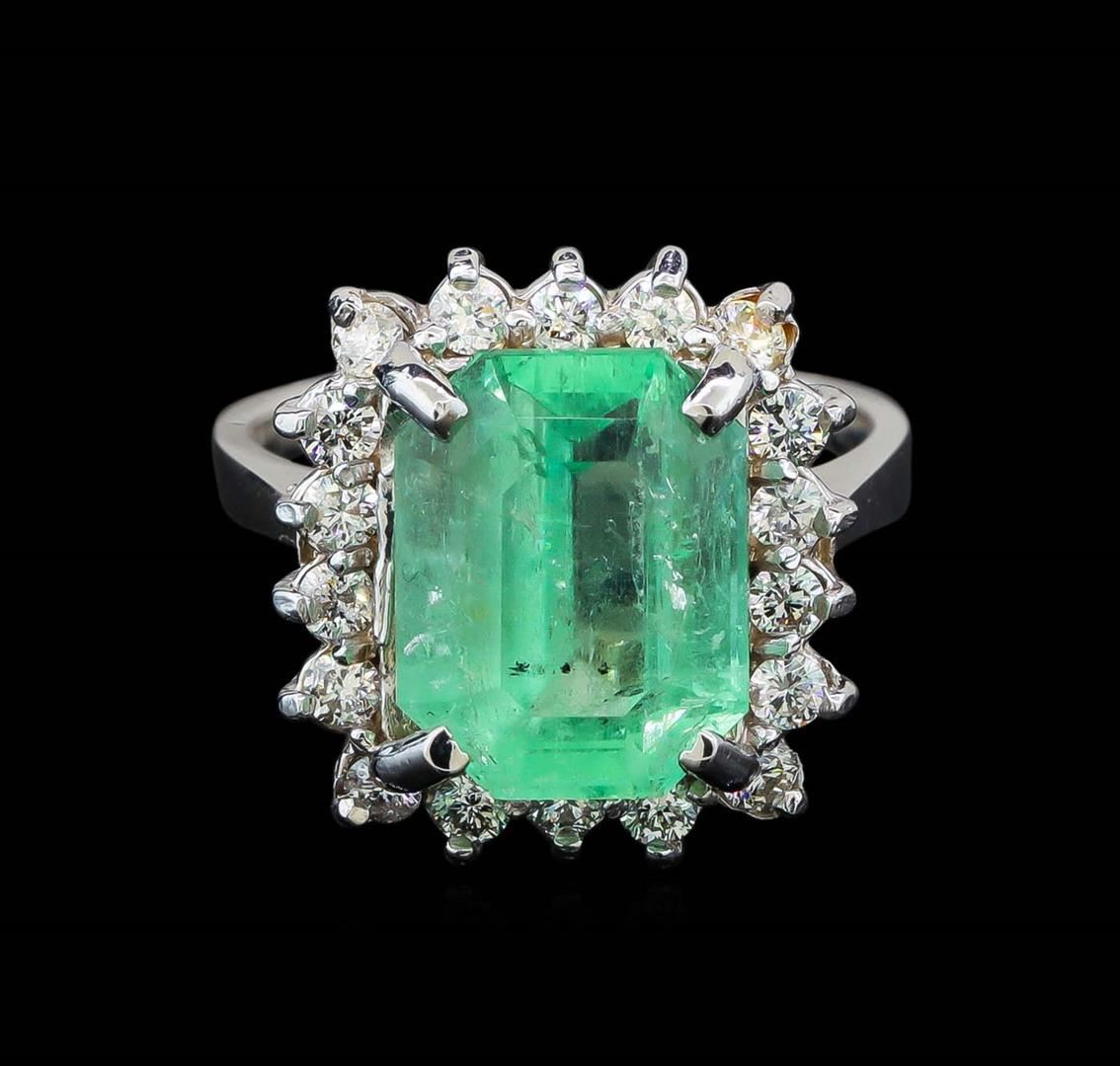 One electronically tested 14KT white gold lady's cast fashion ring with a basket halo with a bright polish finish. The featured lady's ring has a shank measuring 2.77 millimeters wide. Identified with markings of '14K'. Condition is new, good workmanship. Containing: One prong set emerald step cut natural emerald, measuring 11.55 x 9.01 x 6.56mm, (depth est.) approximate weight of 4.88ct., clarity is moderately included, medium light, moderately strong, green color, (GIA G 4/4), cut is good. Transmitting light somewhat diffusely, transparent to translucent. Naturally occurring internal & external characteristics are present. Indications of oil residue. Colored gemstones are presumed to have been subjected to commonly used enhancement processes. Graded in the setting. Eighteen prong set round brilliant cut diamonds, measuring 2.10 - 2.00 x 1.27mm (depth est.) approximate total weight of 18 Stones = 0.60ct. Graded in the setting. Clarity SI-1 to SI-2. Color: H - I Cut Good. Total Weight of Colored Stones 4.88ct.. Total Weight of Diamonds 0.60ct.. Total Weight of Ring 6.40gm. GAS Appraised at $9,195.00.