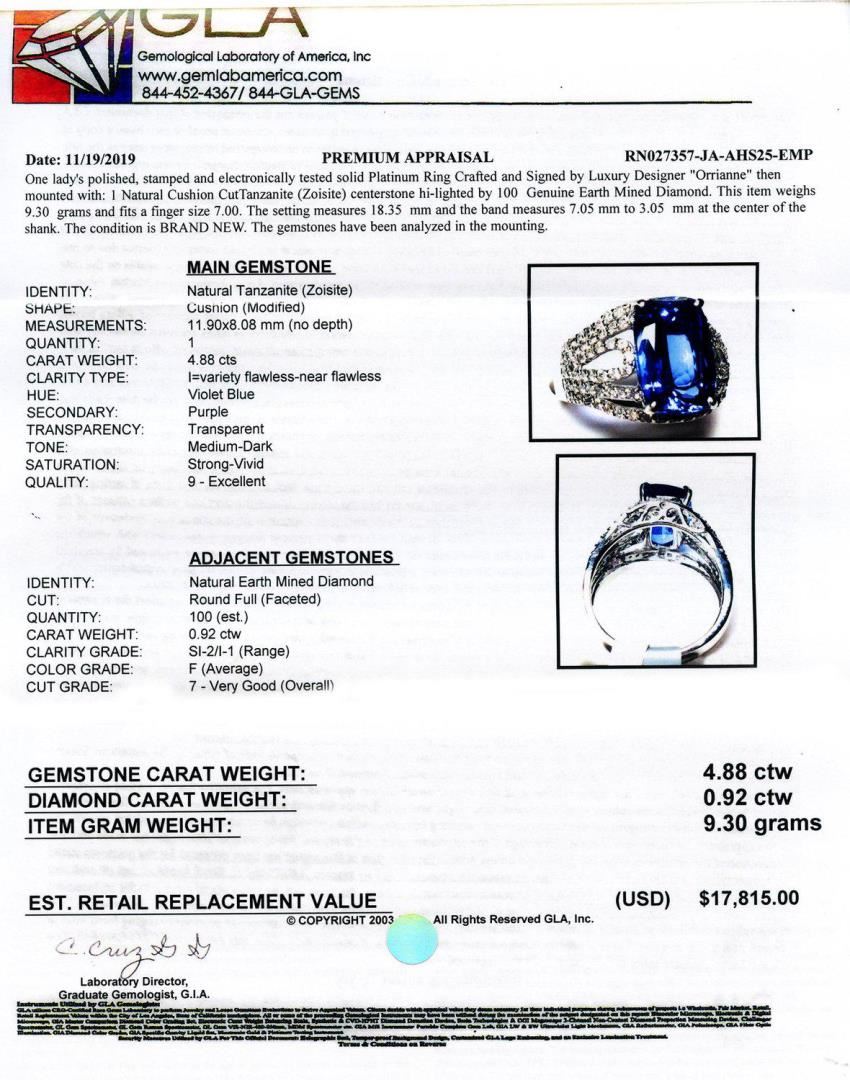 One lady's polished, stamped and electronically tested solid Platinum Ring Crafted and Signed by Luxury Designer "Orrianne" then mounted with: I Natural Cushion CutTanzanite (Zoisite) centerstone hi-lighted by 100 Genuine Earth Mined Diamond. This item weighs 9.30 grams and fits a finger size 7.00. The setting measures 18.35 mm and the band measures 7.05 mm to 3.05 mm at the center of the shank. The condition is BRAND NEW. The gemstones have been analyzed in the mounting. MAIN GEMSTONE IDENTITY: Natural Tanzanite (Zoisite) SHAPE: Cushion (Modified) MEASUREMENTS: 11.90 x 8.08mm (no depth) QUANTITY: 1 CARAT WEIGHT: 4.88ct CLARITY TYPE: 1=variety flawless-near flawless HUE: Violet Blue SECONDARY: Purple TRANSPARENCY: Transparent TONE: Medium-Dark SATURATION: Strong-Vivid QUALITY: 9 - Excellent ADJACENT GEMSTONES IDENTITY: Natural Earth Mined Diamond CUT: Round Full (Faceted) QUANTITY: 100 (est.) CARAT WEIGHT: 0.92ctw CLARITY GRADE: SI2/I1 (Range) COLOR GRADE: F (Average) CUT GRADE: 7 - Very Good (Overall) GEMSTONE CARAT WEIGHT: 4.88ct DIAMOND CARAT WEIGHT: 0.92ctw ITEM GRAM WEIGHT: 9.30 grams Size: 7