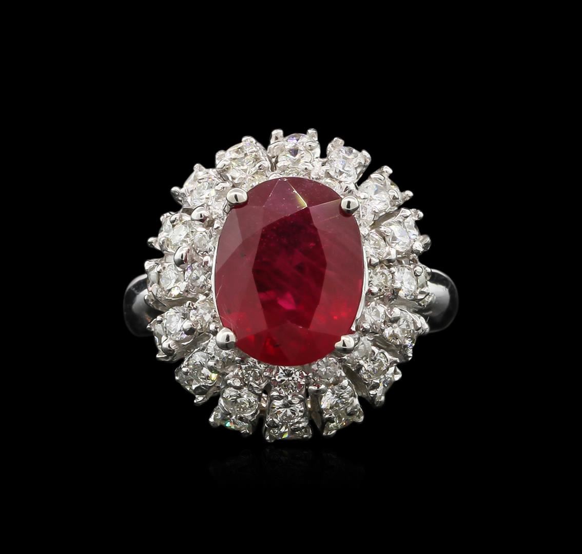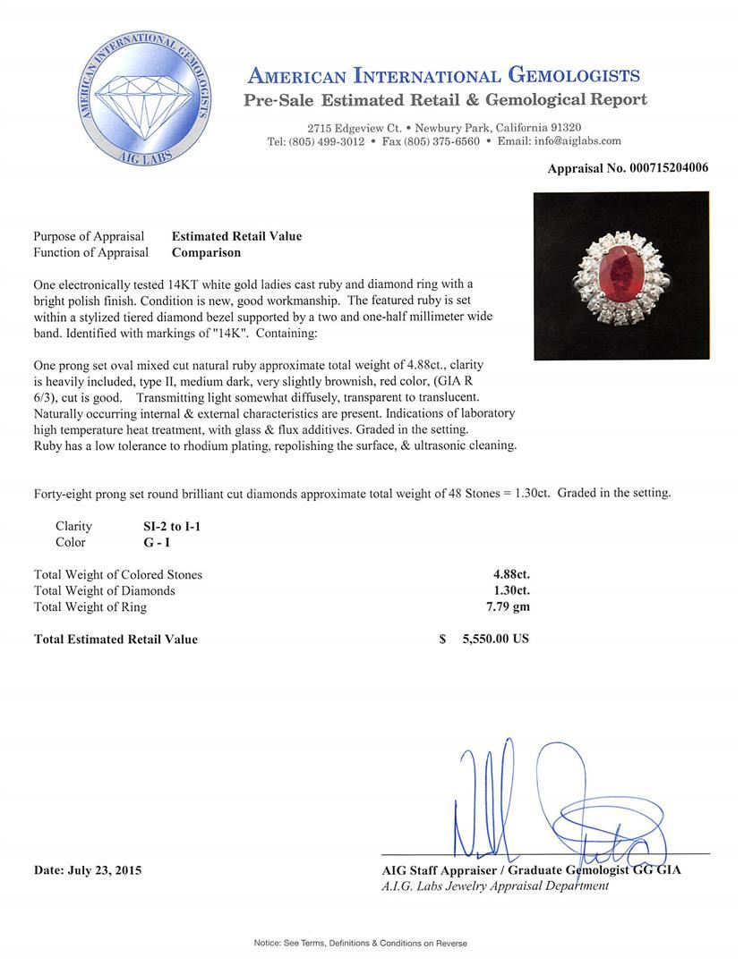 One electronically tested 14KT white gold ladies cast ruby and diamond ring with a bright polish finish. The featured ruby is set within a stylized tiered diamond bezel supported by a two and one-half millimeter wide band. Identified with markings of "14K". Condition is new, good workmanship. Containing: One prong set oval mixed cut natural ruby approximate. Total Weight of 4.88ct., clarity is heavily included, type II, medium dark, very slightly brownish, red color, (GIA R 6/3), cut is good. Transmitting light somewhat diffusely, transparent to translucent. Naturally occurring internal & external characteristics are present. Indications of laboratory high temperature heat treatment, with glass & flux additives. Graded in the setting. Ruby has a low tolerance to rhodium plating, repolishing the surface, & ultrasonic cleaning. Forty-Eight prong set round brilliant cut diamonds approximate. Total Weight of 48 Stones = 1.30ct. Graded in the setting. Clarity: SI-2 to I-1. Color: G - I. Total Weight of Colored Stones 4.88ct. Total Weight of Diamonds 1.30ct. Total Weight of Ring 7.79gm. AIG Appraised at $5,550.00.