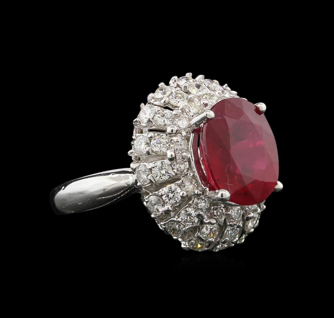 One electronically tested 14KT white gold ladies cast ruby and diamond ring with a bright polish finish. The featured ruby is set within a stylized tiered diamond bezel supported by a two and one-half millimeter wide band. Identified with markings of "14K". Condition is new, good workmanship. Containing: One prong set oval mixed cut natural ruby approximate. Total Weight of 4.88ct., clarity is heavily included, type II, medium dark, very slightly brownish, red color, (GIA R 6/3), cut is good. Transmitting light somewhat diffusely, transparent to translucent. Naturally occurring internal & external characteristics are present. Indications of laboratory high temperature heat treatment, with glass & flux additives. Graded in the setting. Ruby has a low tolerance to rhodium plating, repolishing the surface, & ultrasonic cleaning. Forty-Eight prong set round brilliant cut diamonds approximate. Total Weight of 48 Stones = 1.30ct. Graded in the setting. Clarity: SI-2 to I-1. Color: G - I. Total Weight of Colored Stones 4.88ct. Total Weight of Diamonds 1.30ct. Total Weight of Ring 7.79gm. AIG Appraised at $5,550.00.