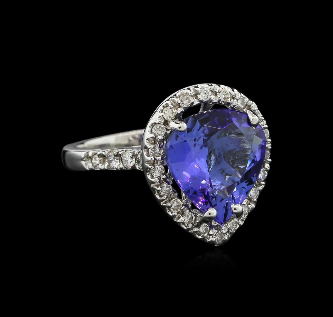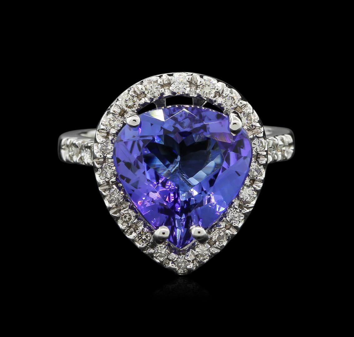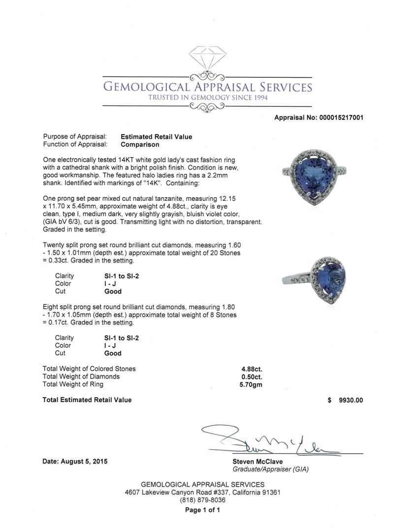 One electronically tested 14KT white gold lady's cast fashion ring with a cathedral shank with a bright polish finish. The featured halo ladies ring has a 2.2mm shank. Identified with markings of "14K". Condition is new, good workmanship. Containing: One prong set pear mixed cut natural tanzanite, measuring 12.15 x 11.70 x 5.45mm, approximate weight of 4.88ct., clarity is eye clean, type I, medium dark, very slightly grayish, bluish violet color, (GIA bV 6/3), cut is good. Transmitting light with no distortion, transparent. Graded in the setting. Twenty split prong set round brilliant cut diamonds, measuring 1.60 - 1.50 x 1.01mm (depth est.) approximate. Total Weight of 20 Stones = 0.33ct. Graded in the setting. Clarity: SI-1 to SI-2. Color: I - Good Eight split prong set round brilliant cut diamonds, measuring 1.80 - 1.70 x 1.05mm (depth est.) approximate. Total Weight of 8 Stones = 0.17ct. Graded in the setting. Clarity: SI-1 to SI-2. Color: I - Good. Total Weight of Colored Stones 4.88ct. Total Weight of Diamonds 0.50ct. Total Weight of Ring 5.70gm. GAS Appraised at $9,930.00.