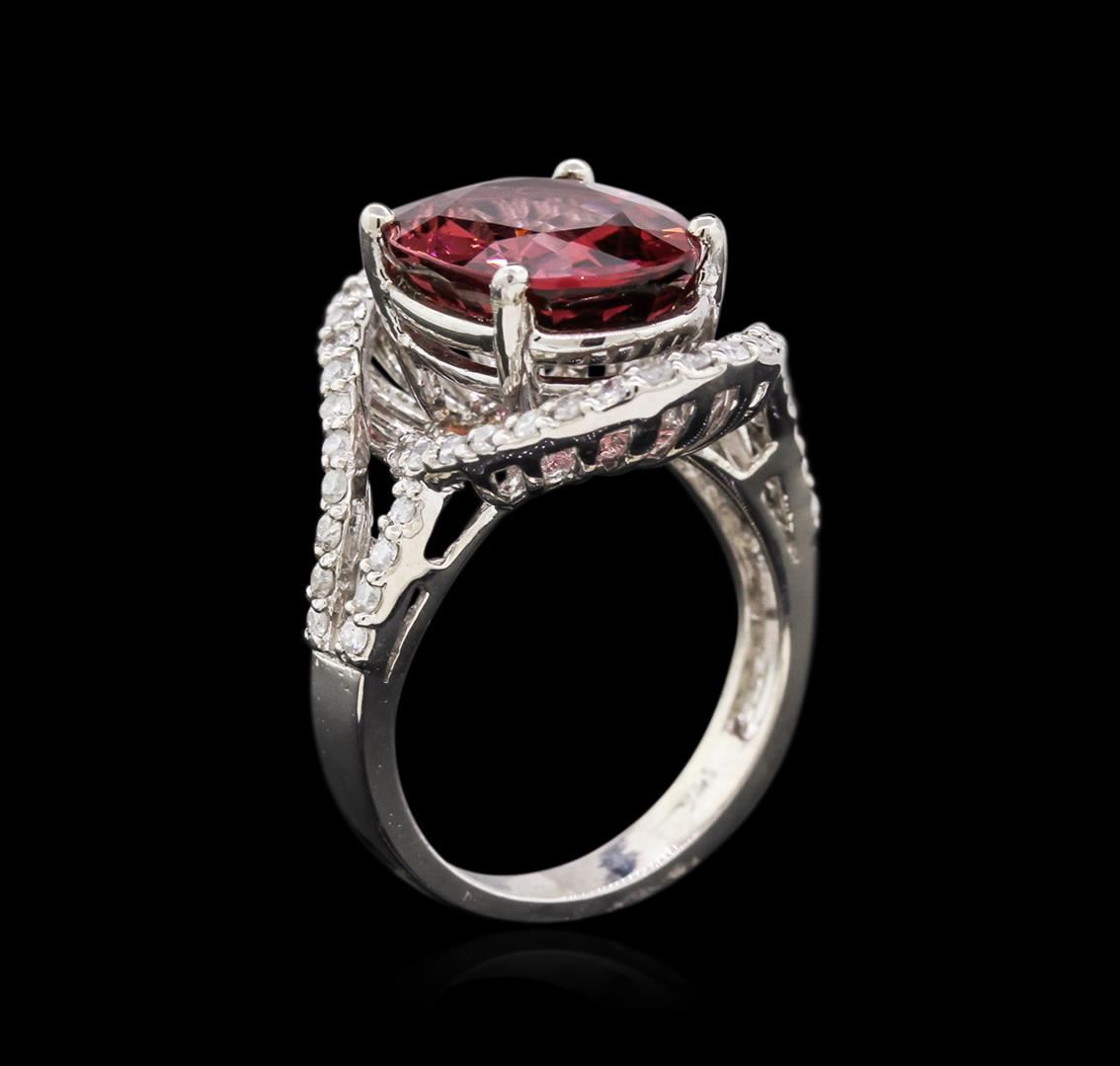 One 14KT white gold tourmaline and diamond ring. An oval cut tourmaline gemstone is prong mounted in the center of the ring. Round brilliant cut diamonds accent the ring around the center gemstone and on both sides. The ring is cast stamped "14K" and has a gross weight of 6.3 Grams. Diamond(s): Shape: Round Brilliant Cut. Weight: 0.45 carat. Average Clarity: I1. Average Color: H-J. Symmetry: Very Good. Polish: Very Good. GemStone(s): Tourmaline. Nature: Natural. Shape: Oval, Faceted. Quantity: 1, Mounted. Weight: 4.89 carat. Dimensions: Length - 12.93 mm. ; Width - 9.56 mm. Bulge: Visible. Clarity: SI, Type 2. Color: Pinkish Red (4/4). Symmetry: Very Good. Color Intensity: Medium. Transparency: Transparent. Tone: Medium. Metal(s): Metal: Gold, Stamped. Purity: 14K. Color: White. Condition: Excellent. Finish: High polish. GGA Appraised at $6,285.00.