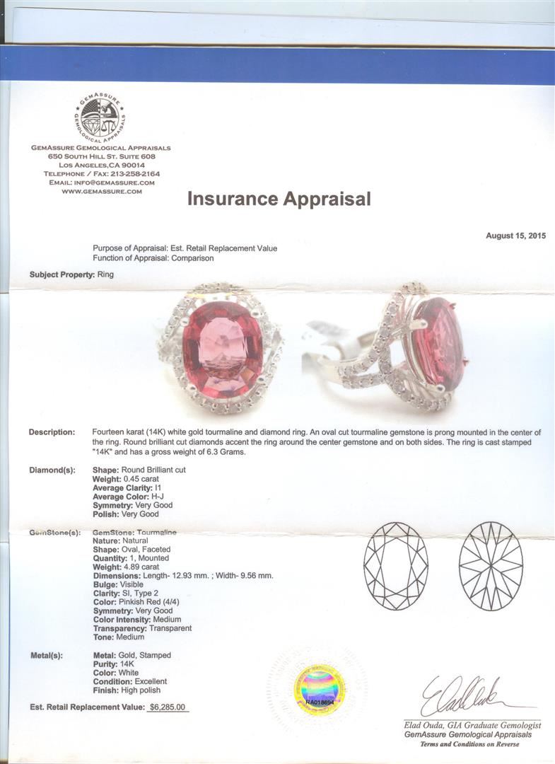 One 14KT white gold tourmaline and diamond ring. An oval cut tourmaline gemstone is prong mounted in the center of the ring. Round brilliant cut diamonds accent the ring around the center gemstone and on both sides. The ring is cast stamped "14K" and has a gross weight of 6.3 Grams. Diamond(s): Shape: Round Brilliant Cut. Weight: 0.45 carat. Average Clarity: I1. Average Color: H-J. Symmetry: Very Good. Polish: Very Good. GemStone(s): Tourmaline. Nature: Natural. Shape: Oval, Faceted. Quantity: 1, Mounted. Weight: 4.89 carat. Dimensions: Length - 12.93 mm. ; Width - 9.56 mm. Bulge: Visible. Clarity: SI, Type 2. Color: Pinkish Red (4/4). Symmetry: Very Good. Color Intensity: Medium. Transparency: Transparent. Tone: Medium. Metal(s): Metal: Gold, Stamped. Purity: 14K. Color: White. Condition: Excellent. Finish: High polish. GGA Appraised at $6,285.00.