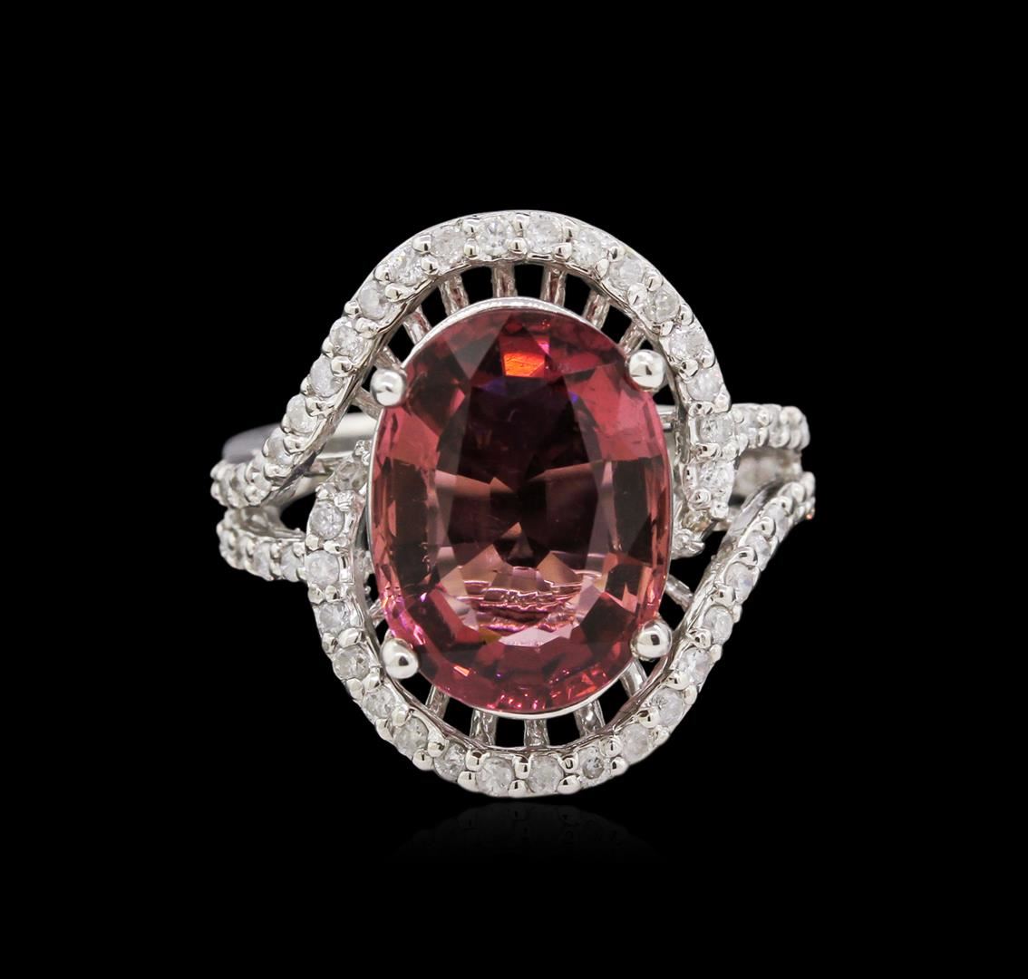 One 14KT white gold tourmaline and diamond ring. An oval cut tourmaline gemstone is prong mounted in the center of the ring. Round brilliant cut diamonds accent the ring around the center gemstone and on both sides. The ring is cast stamped "14K" and has a gross weight of 6.3 Grams. Diamond(s): Shape: Round Brilliant Cut. Weight: 0.45 carat. Average Clarity: I1. Average Color: H-J. Symmetry: Very Good. Polish: Very Good. GemStone(s): Tourmaline. Nature: Natural. Shape: Oval, Faceted. Quantity: 1, Mounted. Weight: 4.89 carat. Dimensions: Length - 12.93 mm. ; Width - 9.56 mm. Bulge: Visible. Clarity: SI, Type 2. Color: Pinkish Red (4/4). Symmetry: Very Good. Color Intensity: Medium. Transparency: Transparent. Tone: Medium. Metal(s): Metal: Gold, Stamped. Purity: 14K. Color: White. Condition: Excellent. Finish: High polish. GGA Appraised at $6,285.00.