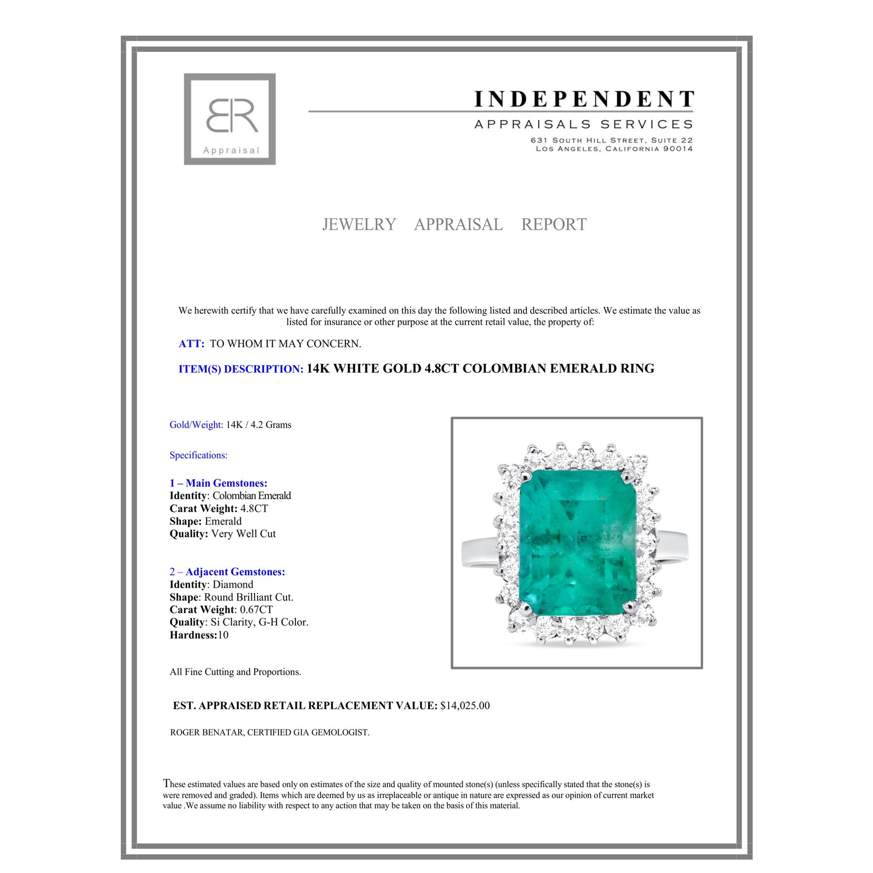 14k White Gold : 4.2gm / Colombian Emerald : 4.8ct / Diamond : 0.67ct / #LEm15