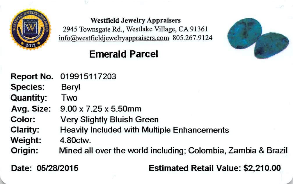 Two oval mixed cut natural emeralds, measuring 9.00 x 7.25 x 5.50mm, exact total weight 4.80ct., clarity is heavily included, type III, medium dark, very slightly grayish, very slightly bluish green color, (GIA vslbG 6/3), cut is good. Transmitting light somewhat diffusely, translucent, Naturally occurring internal & external characteristics are present, Indications of multiple laboratory enhancements, including high temperature heat treatment. Westfield Appraised at $2,210.00.