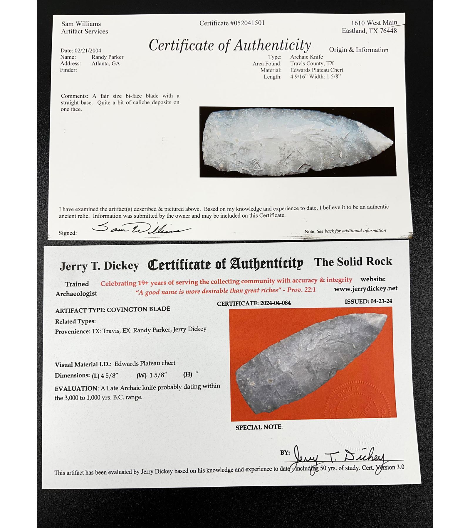 4 9/16" Covington Blade, Sam Williams and Dickey COA, Found in Travis Co. Texas