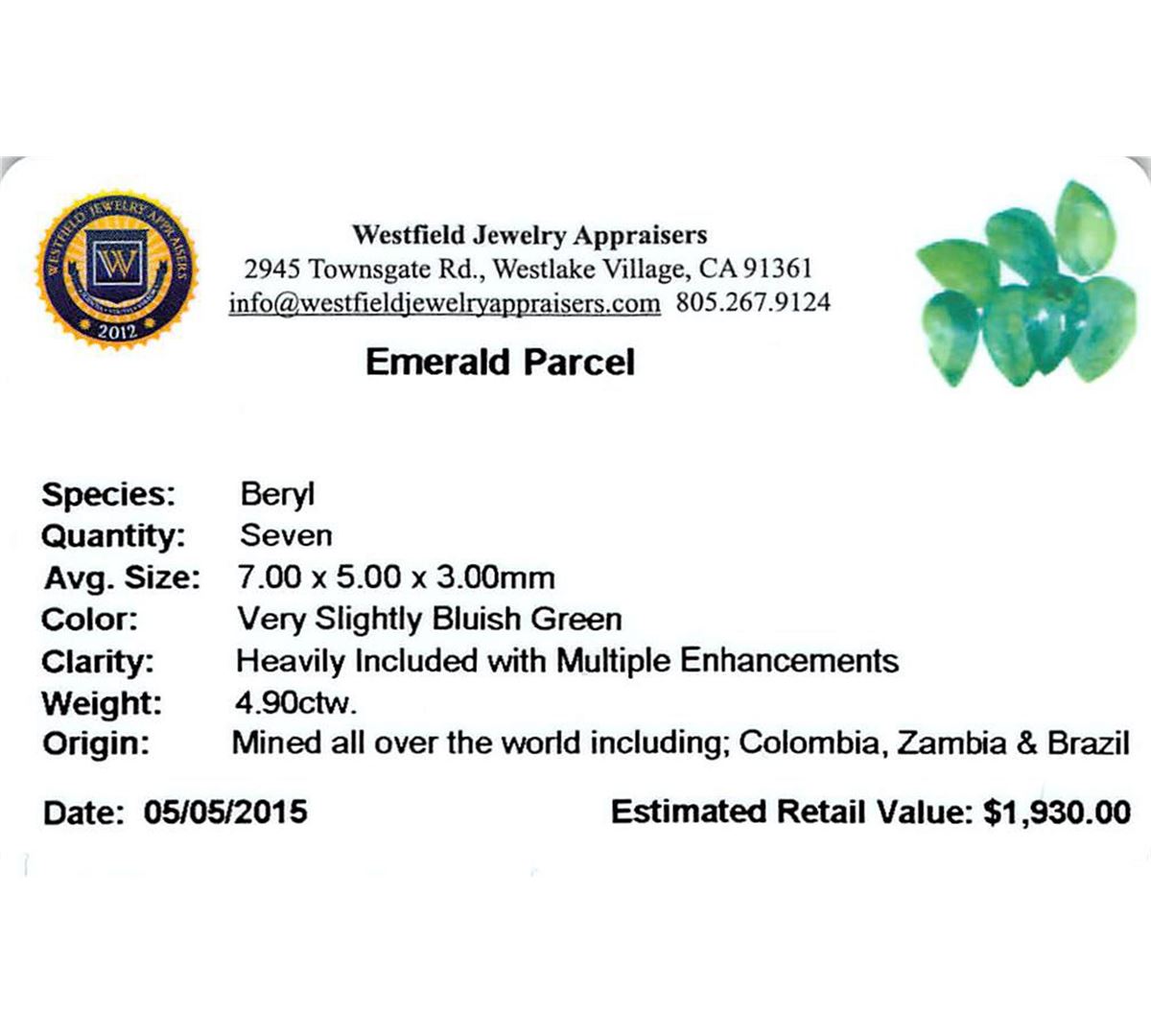 Seven pear mixed cut natural emeralds, measuring 7.00 x 5.00 x 3.00mm, exact total weight 4.90ct., clarity is heavily included, type III, medium, very slightly grayish, very slightly bluish green color, (GIA vslbG 5/3), cut is good. Indications of multiple laboratory enhancements, including high temperature heat treatment. Westfield Appraised at $1,930.00.
