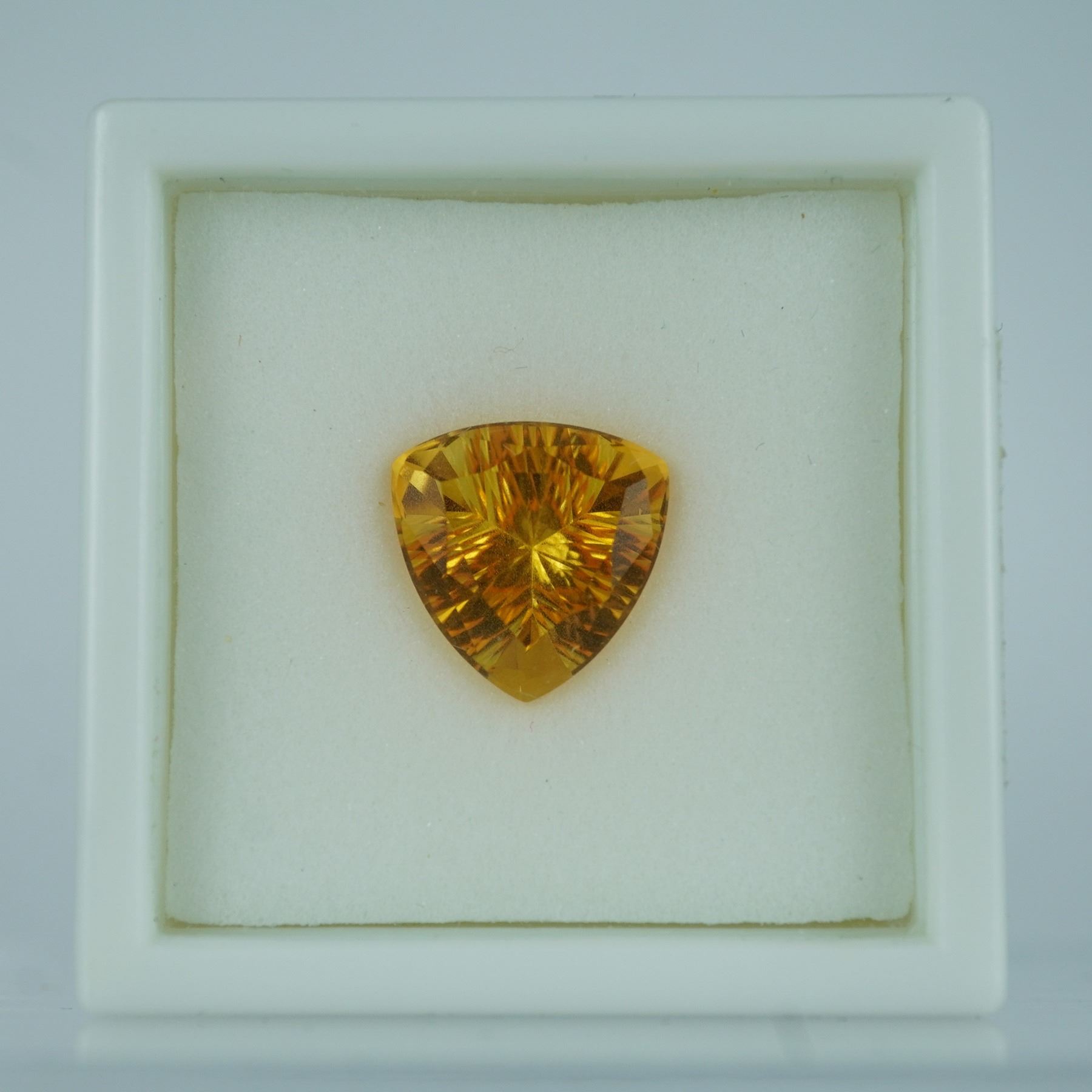 This radiant citrine gemstone features a striking golden hue and an expertly executed trillion cut in the advanced quantum style, designed to enhance brilliance and light dispersion. Weighing approximately 4.90 carats, this gem is perfect for fine jewelry settings that call for bold color and precision cutting. It is presented in a protective case for secure storage.