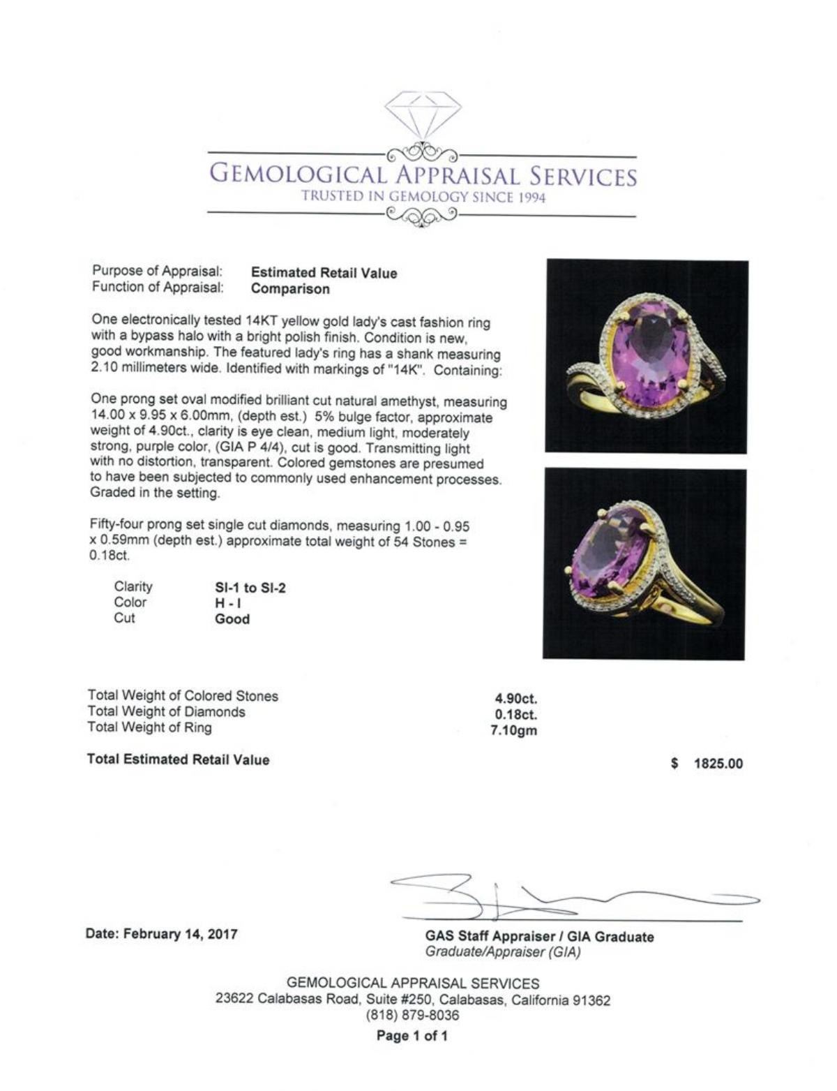 One electronically tested 14KT yellow gold lady's cast fashion ring with a bypass halo with a bright polish finish. The featured lady's ring has a shank measuring 2.10 millimeters wide. Identified with markings of '14K'. Condition is new, good workmanship. Containing: One prong set oval modified brilliant cut natural amethyst, measuring 14.00 x 9.95 x 6.00mm, (depth est.) 5%. bulge factor, approximate weight of 4.90ct., clarity is eye clean, medium light, moderately strong, purple color, (GIA P 4/4), cut is good. Transmitting light with no distortion, transparent. Colored gemstones are presumed to have been subjected to commonly used enhancement processes. Graded in the setting. Fifty-Four prong set single cut diamonds, measuring 1.00 - 0.95 x 0.59mm (depth est.) approximate total weight of 54 Stones = 0.18ct. Clarity SI-1 to SI-2. Color: H - I Cut Good. Total Weight of Colored Stones 4.90ct.. Total Weight of Diamonds 0.18ct.. Total Weight of Ring 7.10gm. GAS Appraised.