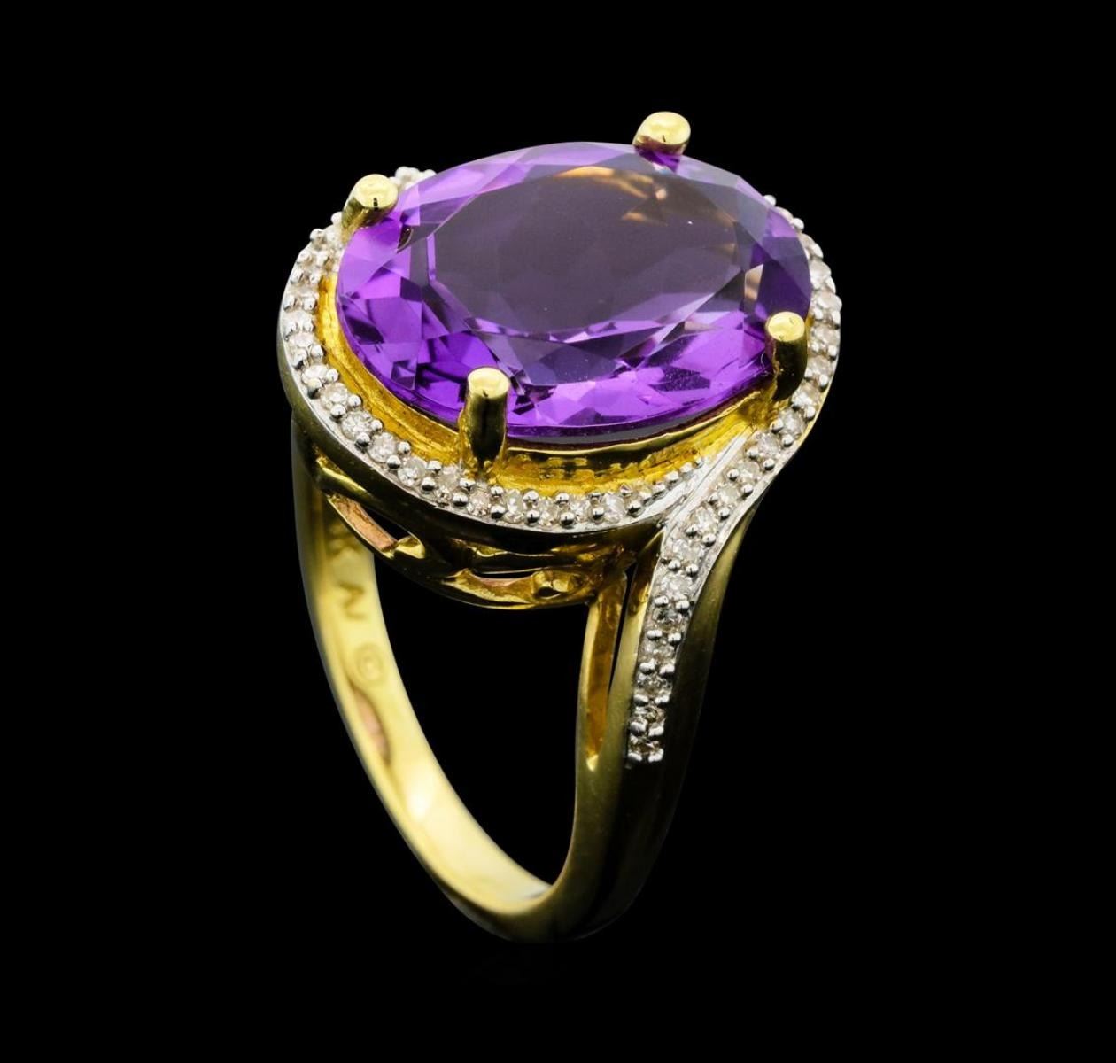 One electronically tested 14KT yellow gold lady's cast fashion ring with a bypass halo with a bright polish finish. The featured lady's ring has a shank measuring 2.10 millimeters wide. Identified with markings of '14K'. Condition is new, good workmanship. Containing: One prong set oval modified brilliant cut natural amethyst, measuring 14.00 x 9.95 x 6.00mm, (depth est.) 5%. bulge factor, approximate weight of 4.90 ct., clarity is eye clean, medium light, moderately strong, purple color, (GIA P 4/4), cut is good. Transmitting light with no distortion, transparent. Colored gemstones are presumed to have been subjected to commonly used enhancement processes. Graded in the setting. Fifty-Four prong set single cut diamonds, measuring 1.00 - 0.95 x 0.59mm (depth est.) approximate total weight of 54 Stones = 0.18ct. Clarity SI-1 to SI-2. Color: H - I Cut Good. Total Weight of Colored Stones 4.90 ct.. Total Weight of Diamonds 0.18ct.. Total Weight of Ring 7.10gm. GAS Appraised.