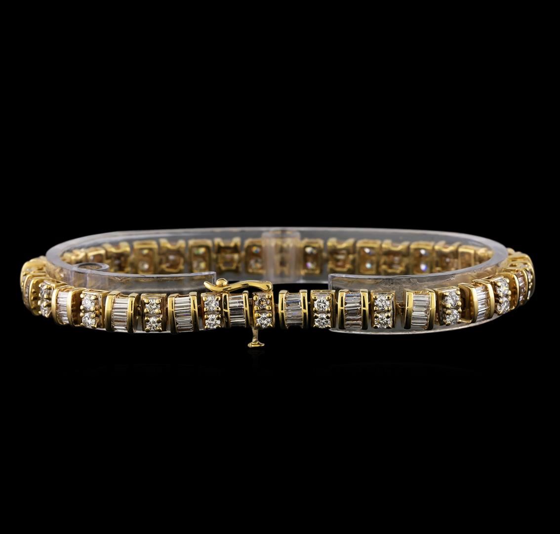 One electronically tested 14KT yellow gold ladies cast & assembled diamond bracelet. Seven and one-half inch length bracelet features a flexible ribbon of alternating round brilliant diamond links and baguette cut diamond links, terminating in a concealed clasp with safety. Bright polish finish with rhodium accents. Trademark is ZEI. Identified with markings of "14K". Condition is good. Containing: Forty-Two prong set round brilliant cut diamonds, measuring 2.70 - 2.30 x 1.50mm (depth est.) approximate total weight of 42 Stones = 2.50ct. Graded in the setting. Clarity: SI-1 to I-1. Color: F - H One Hundred Five channel set baguette cut (tapered) diamonds, measuring from 2.50 x 0.70 x 0.49mm (depth est.) to 2.80 x 1.55 x 1.09mm (depth est.) approximate total weight of 105 Stones = 2.40ct. Graded in the setting. Clarity: SI-1 to SI-2. Color: G - I. Total Weight of Diamonds 4.90ct. Total Weight of Bracelet 22.41gm. AIG Appraised at $18,235.00.