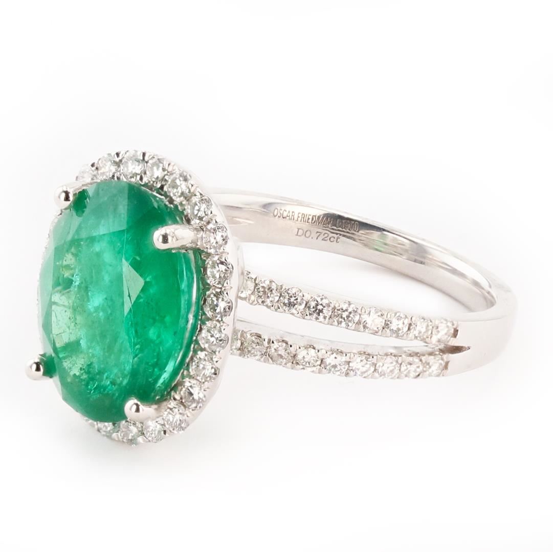 Platinum (PLAT) natural emerald beryl and diamond ring. An oval brilliant cut natural emerald beryl gemstone is mounted in the center of the ring. Round brilliant cut diamonds accent he ring around and on both sides the center gemstone. The ring has a gross weight of 8.2 Grams. #NATURAL GEMSTONE# GEMSTONE: Emerald Beryl; NATURE: Natural; SHAPE: Oval Brilliant, Faceted Cut; WEIGHT: 4.90 carat total; DIMENSIONS: 12.50 x 9.72mm; CLARITY: Type 3; COLOR: Green(5/5); SYMMETRY: Excellent; COLOR INTENSITY: Intense; TRANSPARENCY: Transparent; TONE: Dark #NATURAL DIAMOND# SHAPE: Round Brilliant Cut; WEIGHT: 0.72 carat total (60pcs.); DIMENSIONS: 1.4 x 1.1mm; AVERAGE CLARITY: VS1-VS2; AVERAGE COLOR: F-G; SYMMETRY: Excellent; POLISH: Excellent #METAL# METAL: Platinum; PURITY: 950; COLOR: White; CONDITION: Excellent; FINISH: High Polish #Size: 6 1/2