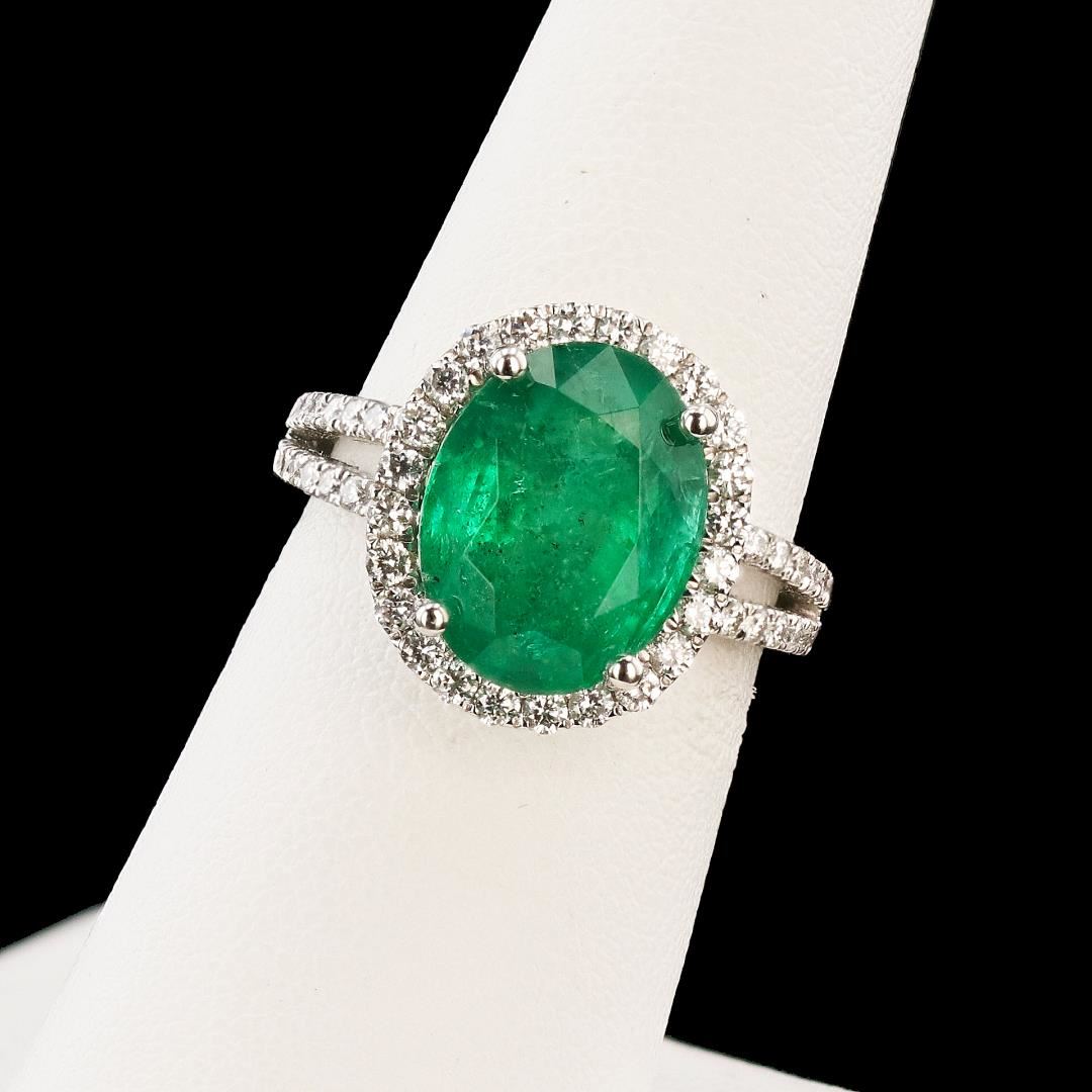 Platinum (PLAT) natural emerald beryl and diamond ring. An oval brilliant cut natural emerald beryl gemstone is mounted in the center of the ring. Round brilliant cut diamonds accent he ring around and on both sides the center gemstone. The ring has a gross weight of 8.2 Grams. #NATURAL GEMSTONE# GEMSTONE: Emerald Beryl; NATURE: Natural; SHAPE: Oval Brilliant, Faceted Cut; WEIGHT: 4.90 carat total; DIMENSIONS: 12.50 x 9.72mm; CLARITY: Type 3; COLOR: Green(5/5); SYMMETRY: Excellent; COLOR INTENSITY: Intense; TRANSPARENCY: Transparent; TONE: Dark #NATURAL DIAMOND# SHAPE: Round Brilliant Cut; WEIGHT: 0.72 carat total (60pcs.); DIMENSIONS: 1.4 x 1.1mm; AVERAGE CLARITY: VS1-VS2; AVERAGE COLOR: F-G; SYMMETRY: Excellent; POLISH: Excellent #METAL# METAL: Platinum; PURITY: 950; COLOR: White; CONDITION: Excellent; FINISH: High Polish #Size: 6 1/2