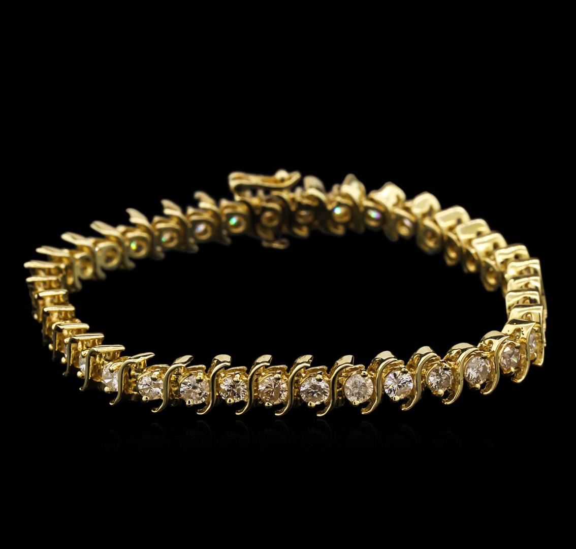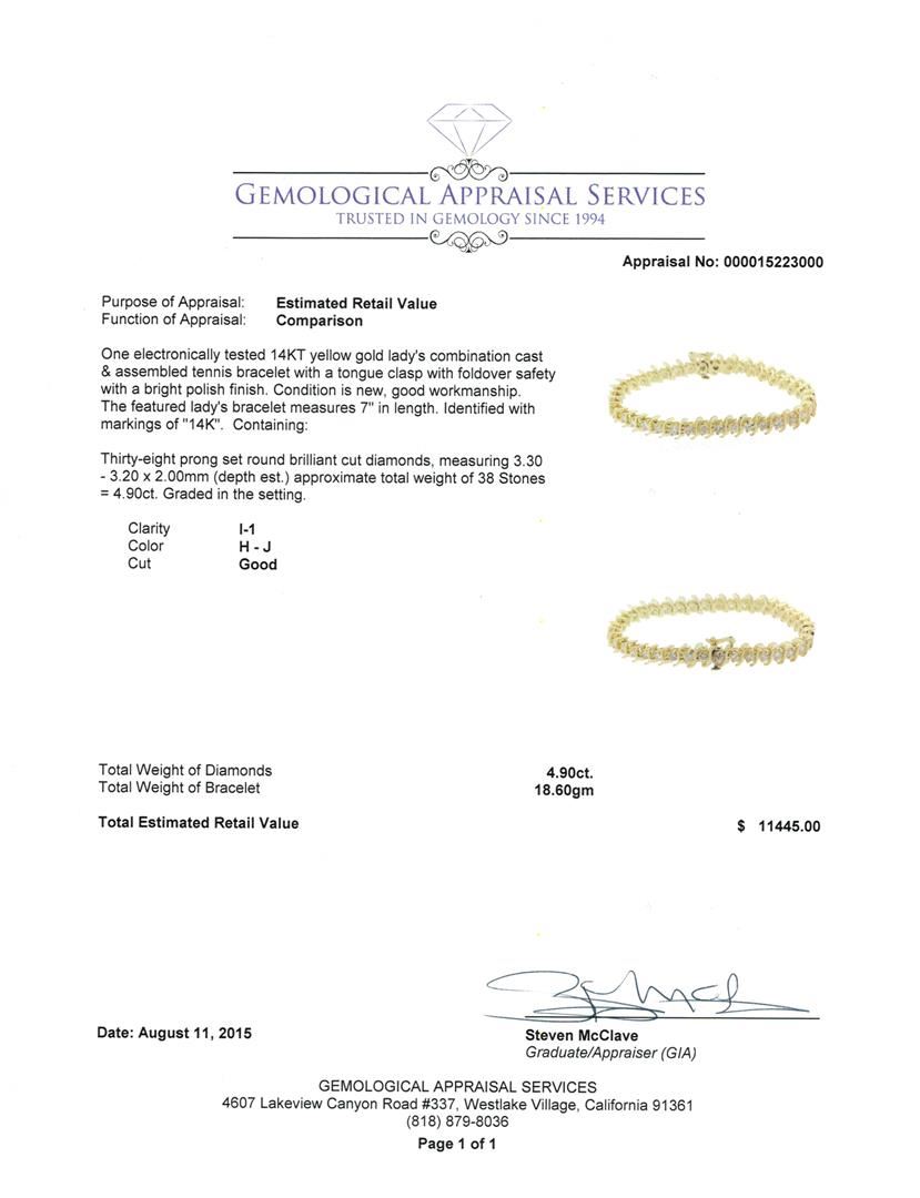 One electronically tested 14KT yellow gold lady's combination cast & assembled tennis bracelet with a tongue clasp with foldover safety with a bright polish finish. The featured lady's bracelet measures 7" in length. Identified with markings of "14K". Condition is new, good workmanship. Containing: Thirty-Eight prong set round brilliant cut diamonds, measuring 3.30 - 3.20 x 2.00mm (depth est.) approximate. Total Weight of 38 Stones = 4.90ct. Graded in the setting. Clarity: I-1. Color: H - J. Cut Good. Total Weight of Diamonds 4.90ct. Total Weight of Bracelet 18.60gm. GAS Appraised at $11,445.00.