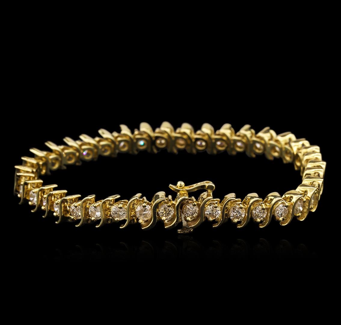 One electronically tested 14KT yellow gold lady's combination cast & assembled tennis bracelet with a tongue clasp with foldover safety with a bright polish finish. The featured lady's bracelet measures 7" in length. Identified with markings of "14K". Condition is new, good workmanship. Containing: Thirty-Eight prong set round brilliant cut diamonds, measuring 3.30 - 3.20 x 2.00mm (depth est.) approximate. Total Weight of 38 Stones = 4.90ct. Graded in the setting. Clarity: I-1. Color: H - J. Cut Good. Total Weight of Diamonds 4.90ct. Total Weight of Bracelet 18.60gm. GAS Appraised at $11,445.00.