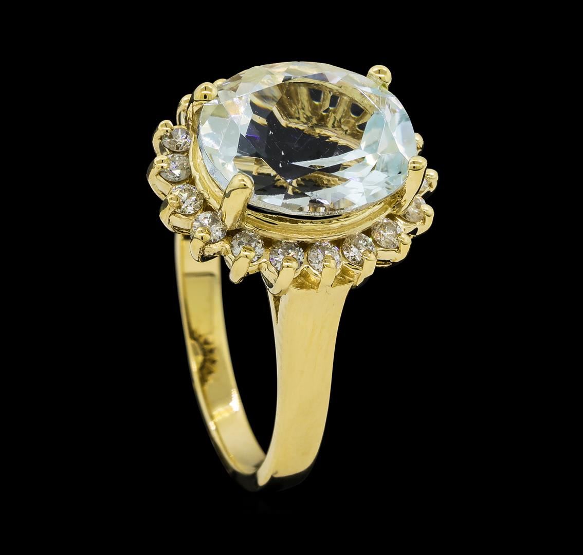 One Aquamarine and Diamond Ring including: 14KT Yellow Gold weighing a total of 5.21 grams, Aquamarine weighing a total of 4.91ct, and 18 Diamonds weighing a total of 0.44ctw.