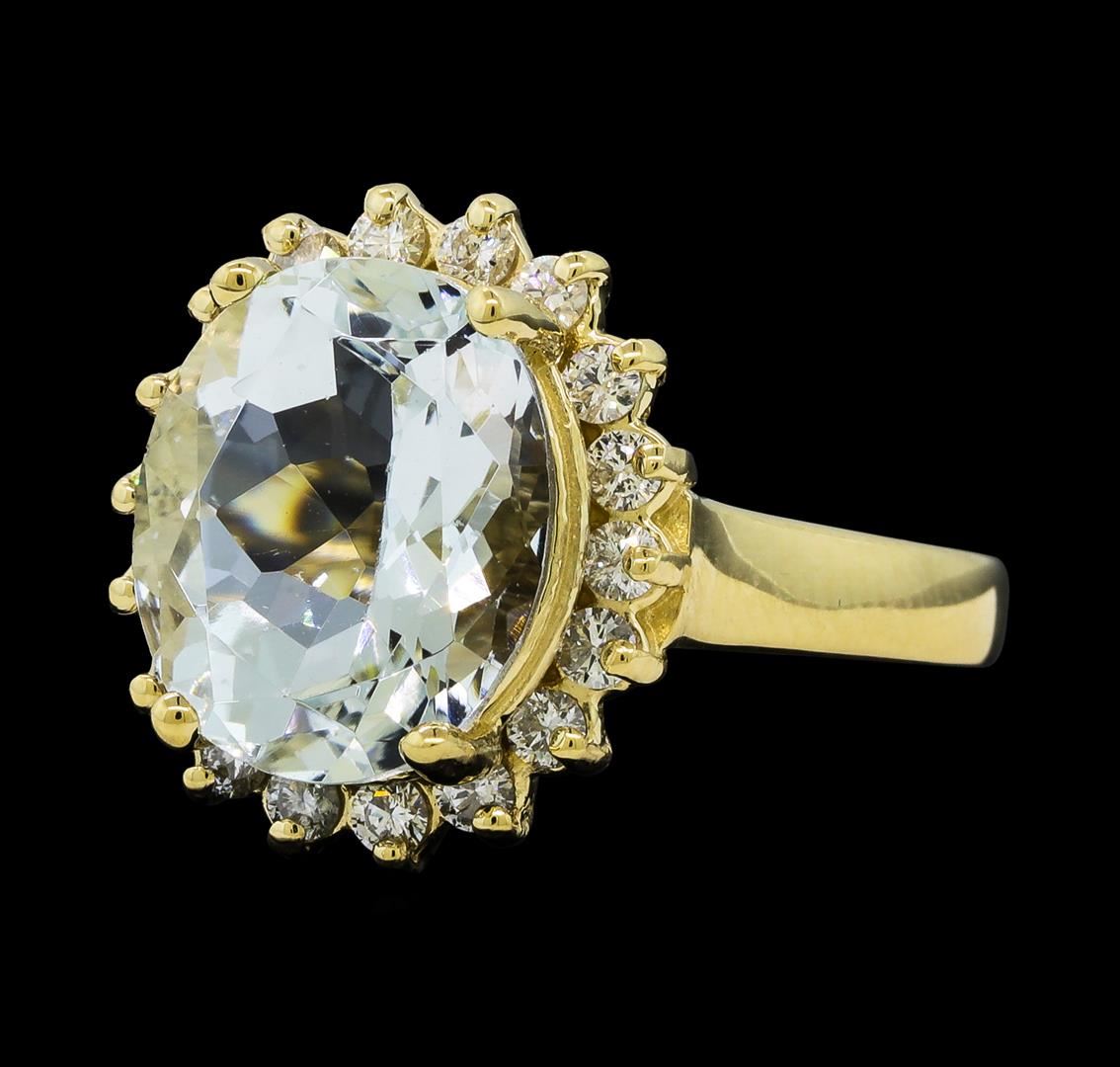 One Aquamarine and Diamond Ring including: 14KT Yellow Gold weighing a total of 5.21 grams, Aquamarine weighing a total of 4.91ct, and 18 Diamonds weighing a total of 0.44ctw.