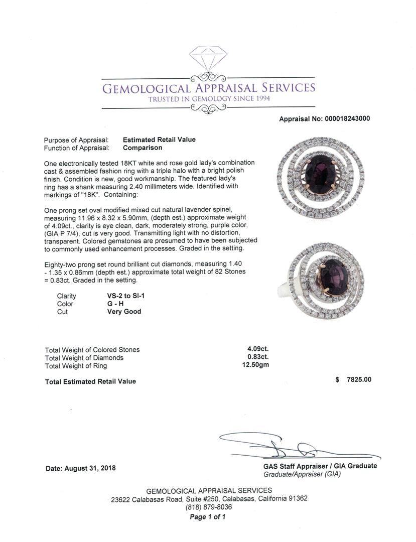 One electronically tested 18KT white and rose gold lady's combination cast & assembled fashion ring with a triple halo with a bright polish finish. The featured lady's ring has a shank measuring 2.40 millimeters wide. Identified with markings of '18K'. Condition is new, good workmanship. Containing: One prong set oval modified mixed cut natural lavender spinel, measuring 11.96 x 8.32 x 5.90mm, (depth est.) approximate weight of 4.09ct., clarity is eye clean, dark, moderately strong, purple color, (GIA P 7/4), cut is very good. Transmitting light with no distortion, transparent. Colored gemstones are presumed to have been subjected to commonly used enhancement processes. Graded in the setting. Eighty-Two prong set round brilliant cut diamonds, measuring 1.40 - 1.35 x 0.86mm (depth est.) approximate total weight of 82 Stones = 0.83ct. Graded in the setting. Color G - H Clarity VS-2 to SI-1 Cut Very Good. Total Weight of Colored Stones 4.09ct.. Total Weight of Diamonds 0.83ct.. Total Weight of Ring 12.50gm GAS Appraised at $7825.00. GAS Appraised.