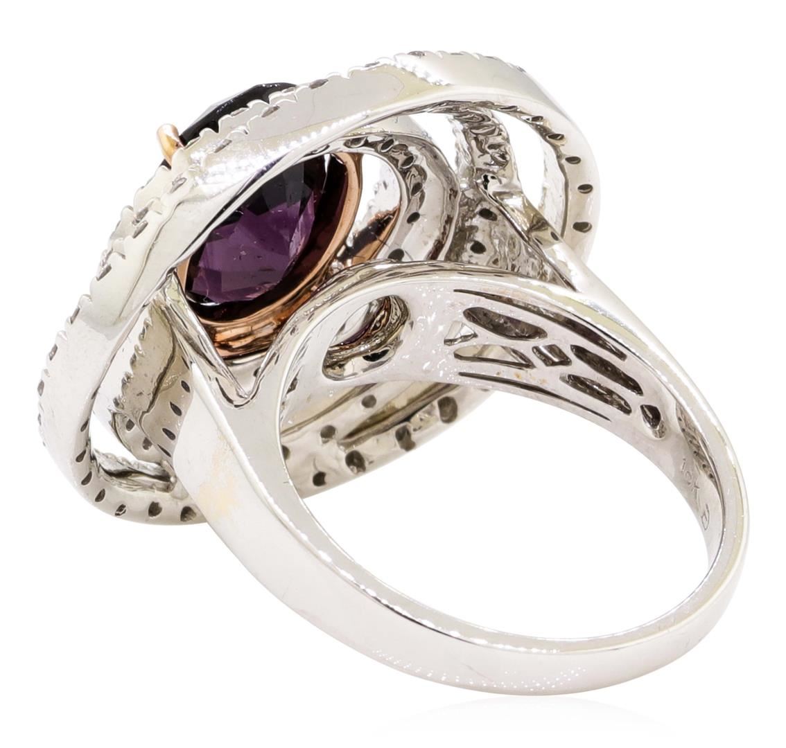 One electronically tested 18KT white and rose gold lady's combination cast & assembled fashion ring with a triple halo with a bright polish finish. The featured lady's ring has a shank measuring 2.40 millimeters wide. Identified with markings of '18K'. Condition is new, good workmanship. Containing: One prong set oval modified mixed cut natural lavender spinel, measuring 11.96 x 8.32 x 5.90mm, (depth est.) approximate weight of 4.09ct., clarity is eye clean, dark, moderately strong, purple color, (GIA P 7/4), cut is very good. Transmitting light with no distortion, transparent. Colored gemstones are presumed to have been subjected to commonly used enhancement processes. Graded in the setting. Eighty-Two prong set round brilliant cut diamonds, measuring 1.40 - 1.35 x 0.86mm (depth est.) approximate total weight of 82 Stones = 0.83ct. Graded in the setting. Color G - H Clarity VS-2 to SI-1 Cut Very Good. Total Weight of Colored Stones 4.09ct.. Total Weight of Diamonds 0.83ct.. Total Weight of Ring 12.50gm GAS Appraised at $7825.00. GAS Appraised.