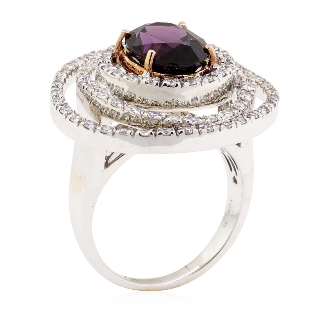 One electronically tested 18KT white and rose gold lady's combination cast & assembled fashion ring with a triple halo with a bright polish finish. The featured lady's ring has a shank measuring 2.40 millimeters wide. Identified with markings of '18K'. Condition is new, good workmanship. Containing: One prong set oval modified mixed cut natural lavender spinel, measuring 11.96 x 8.32 x 5.90mm, (depth est.) approximate weight of 4.09ct., clarity is eye clean, dark, moderately strong, purple color, (GIA P 7/4), cut is very good. Transmitting light with no distortion, transparent. Colored gemstones are presumed to have been subjected to commonly used enhancement processes. Graded in the setting. Eighty-Two prong set round brilliant cut diamonds, measuring 1.40 - 1.35 x 0.86mm (depth est.) approximate total weight of 82 Stones = 0.83ct. Graded in the setting. Color G - H Clarity VS-2 to SI-1 Cut Very Good. Total Weight of Colored Stones 4.09ct.. Total Weight of Diamonds 0.83ct.. Total Weight of Ring 12.50gm GAS Appraised at $7825.00. GAS Appraised.