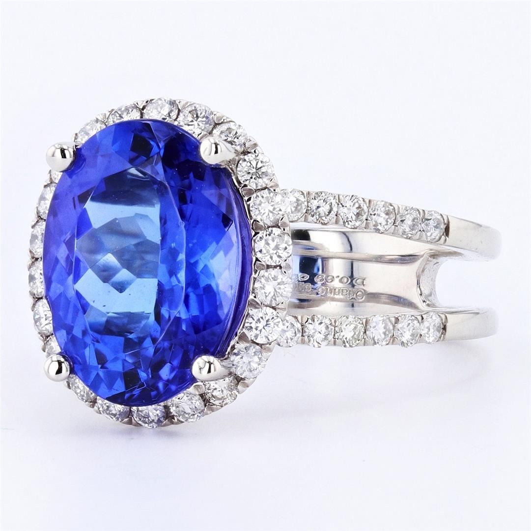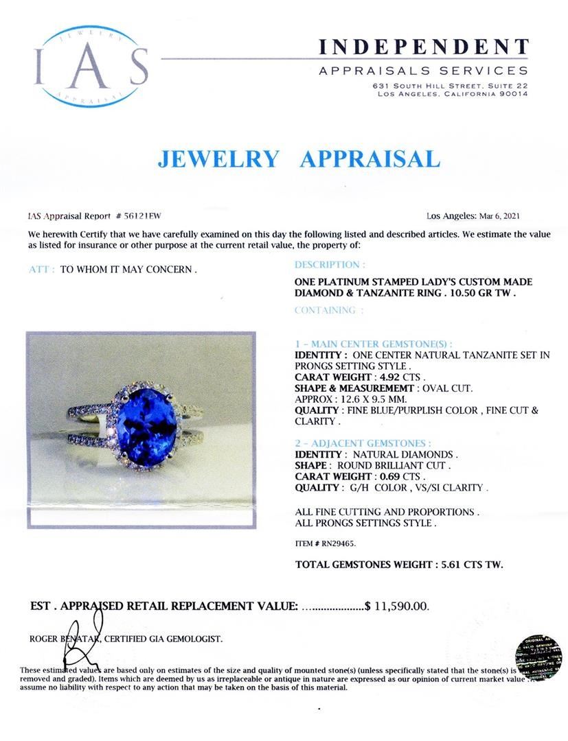 4.92ct Tanzanite and 0.69ctw Diamond Platinum Ring. ONE PLATINUM STAMPED LADY'S CUSTOM MADE DIAMOND & TANZANITE RING. 10.50 GR TW. CONTAINING: 1 â€" MAIN CENTER GEMSTONE(S): IDENTITY : ONE CENTER NATURAL TANZANITE SET IN PRONGS SETTING STYLE. CARAT WEIGHT : 4.92 CT. SHAPE & MEASUREMENT : OVAL CUT. APPROX : 12.6 X 9.5 MM. QUALITY : FINE BLUE/PURPLISH COLOR , FINE CUT & CLARITY. 2 â€" ADJACENT GEMSTONES: IDENTITY : NATURAL DIAMONDS. SHAPE : ROUND BRILLIANT CUT. CARAT WEIGHT : 0.69 CTW. QUALITY : G/H COLOR , VS/SI CLARITY. ALL FINE CUTTING AND PROPORTIONS. ALL PRONGS SETTINGS STYLE. TOTAL GEMSTONES WEIGHT : 5.61 CT TW.