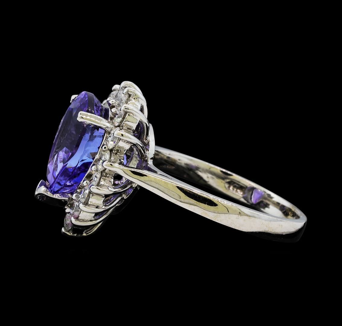 One electronically tested 14KT white gold lady's cast fashion ring with a basket halo with a bright polish finish. The featured lady's ring has a shank measuring 2.40 millimeters wide. Identified with markings of 'K14'. Condition is new, good workmanship. Containing: One prong set pear modified brilliant cut natural tanzanite, measuring 11.60 x 9.57 x 7.34mm, (depth est.) approximate weight of 4.92ct., clarity is eye clean, medium dark, moderately strong, bluish violet color, (GIA bV 6/4), cut is very good. Transmitting light with no distortion, transparent. Colored gemstones are presumed to have been subjected to commonly used enhancement processes. Graded in the setting. Fifteen prong set round brilliant cut diamonds, measuring 2.40 - 2.35 x 1.48mm (depth est.) approximate total weight of 15 Stones = 0.76ct. Graded in the setting. Clarity SI-1 to I-1. Color: H - I Cut Good. Total Weight of Colored Stones 4.92ct.. Total Weight of Diamonds 0.76ct.. Total Weight of Ring 5.50gm. GAS Appraised at $10,645.00.