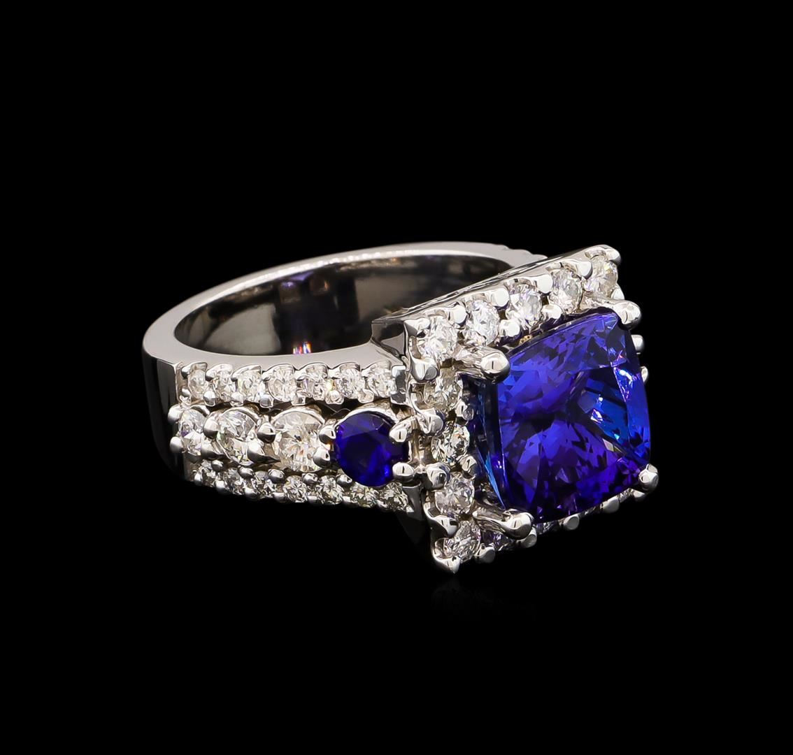 One electronically tested 14KT white gold lady's cast fashion ring with a three row halo with a bright polish finish. The featured lady's ring has a shank measuring 5.07 millimeters wide. Identified with markings of "14K". Condition is new, good workmanship. Containing: One prong set square cushion modified brilliant cut natural tanzanite, measuring 9.31 x 9.26 x 6.69mm, 8%. bulge factor, approximate weight of 4.94ct., clarity is eye clean, type I, medium dark, moderately strong, violetish blue color, (GIA vB 6/4), cut is very good. Transmitting light with no distortion, transparent. Colored gemstones are presumed to have been subjected to commonly used enhancement processes. Graded in the setting. Two prong set round modified brilliant cut natural blue sapphires, measuring 3.70 - 3.68 x 2.40 mm, approximate total weight of 0.50ct., clarity is eye clean, type II, medium dark, strong, blue color, (GIA B 6/5), cut is very good. Transmitting light with no distortion, transparent. Colored gemstones are presumed to have been subjected to commonly used enhancement processes. Graded in the setting. Two prong set round brilliant cut diamonds, measuring 3.10 - 3.05 x 1.91mm (depth est.) approximate total weight of 2 Stones = 0.22ct. Graded in the setting. Clarity: I-1. Color: H - I. Cut Good Four prong set round brilliant cut diamonds, measuring 2.70 - 2.50 x 1.56mm (depth est.) approximate total weight of 4 Stones = 0.25ct. Graded in the setting. Clarity: SI-1 to SI-2. Color: H - I. Cut Good Sixteen prong set round brilliant cut diamonds, measuring 2.30 - 2.20 x 1.40mm (depth est.) approximate total weight of 16 Stones = 0.70ct. Graded in the setting. Clarity: SI-1 to I-1. Color: H - I. Cut Good Twenty-Eight prong set round brilliant cut diamonds, measuring 1.60 - 1.50 x 0.96mm (depth est.) approximate total weight of 28 Stones = 0.40ct. Graded in the setting. Clarity: SI-1 to I-1. Color: H - I. Cut Good. Total Weight of Colored Stones 5.44ct. Total Weight of Diamonds 1.57ct. Total Weight of Ring 12.20gm. GAS Appraised at $14,120.00.
