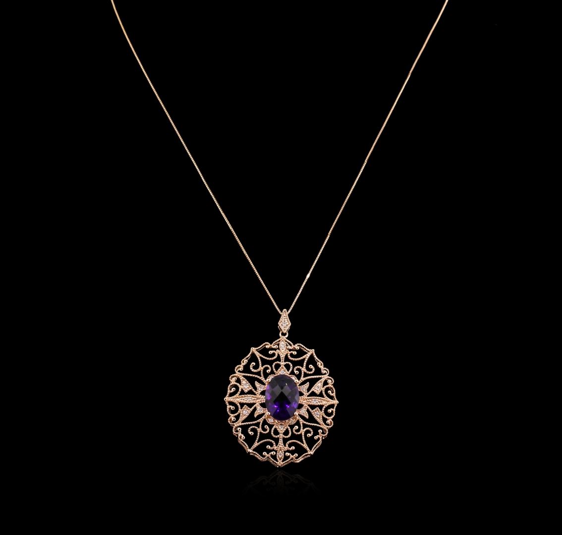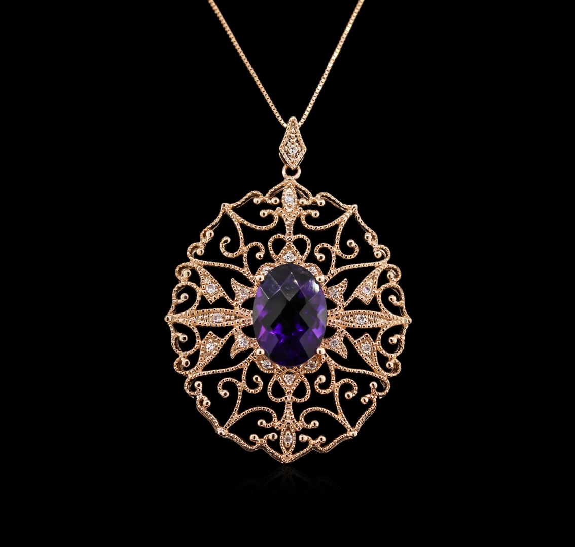 One necklace featuring: 14KT rose gold weighing 7.90 grams containing one amethyst center stone with a total weight of 4.94ct and diamonds with a total weight of 0.20ct.