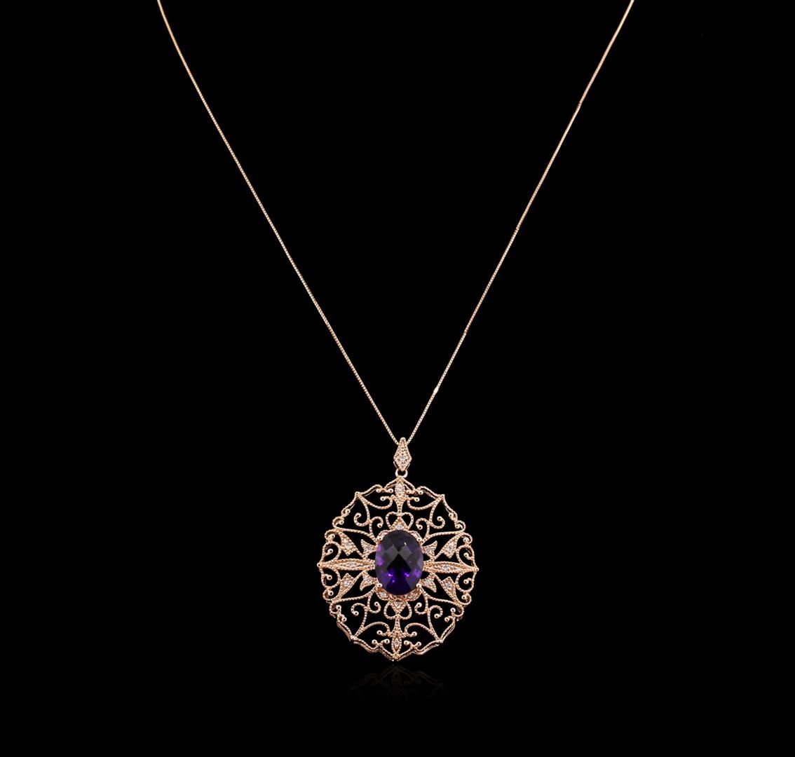 One necklace featuring: 14KT rose gold weighing 7.90 grams containing one amethyst center stone with a total weight of 4.94ct and diamonds with a total weight of 0.20ct.