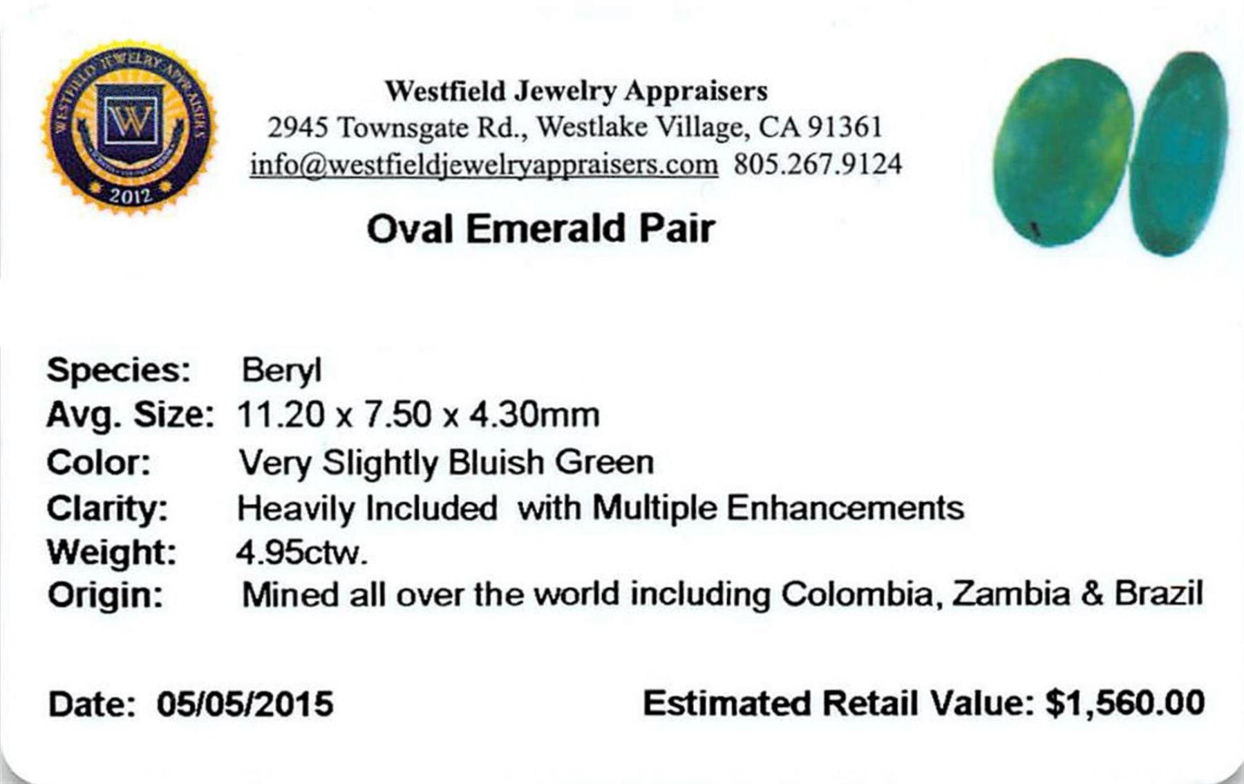 Two oval mixed cut natural emeralds, measuring 11.20 x 7.50 x 4.30mm, exact total weight 4.95ct., clarity is heavily included, type III, dark, very slightly grayish, very slightly bluish green color, (GIA vslbG 7/3), cut is good. Measurements are an average for the pair. Indications of multiple laboratory enhancements, including high temperature heat treatment. Westfield Appraised.