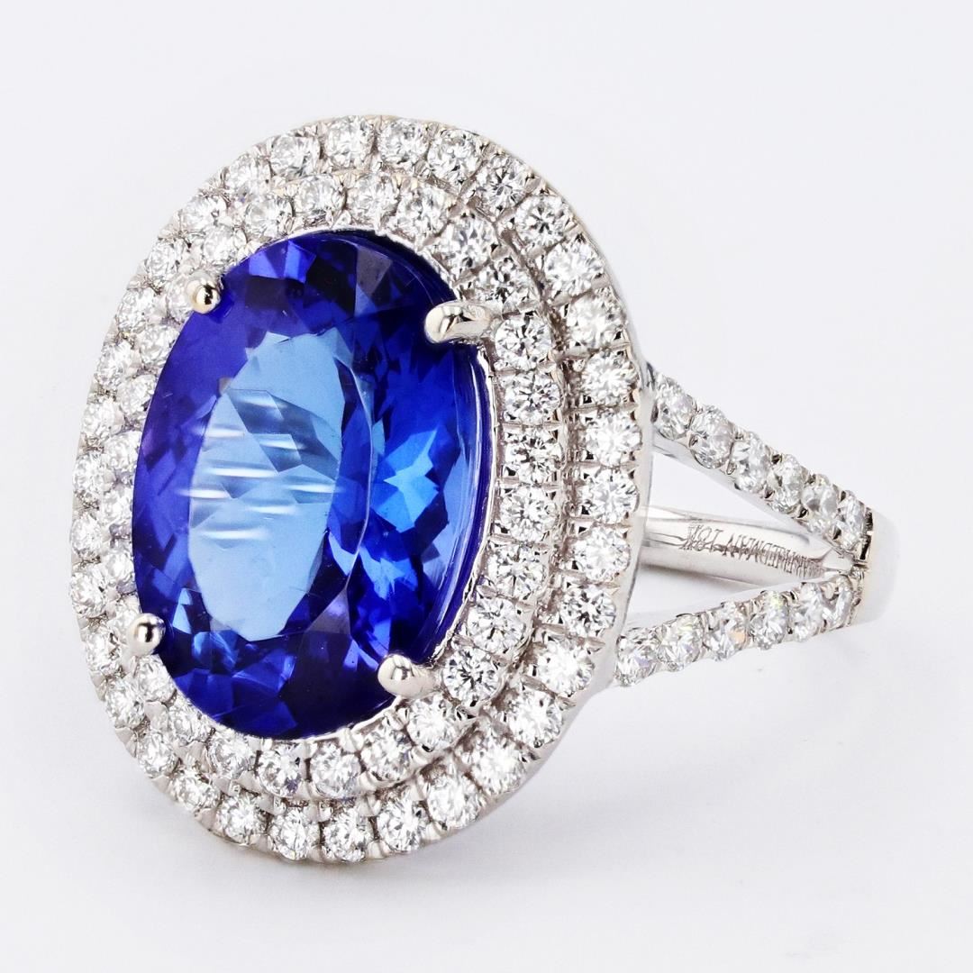 One polished, stamped, and tested 18K white gold ring with a bright finish. The ring is mounted with: 1 genuine tanzanite center stone weighing approximately 4.95 carat, and 86 genuine round diamonds weighing approximately 1.05 carats. This item weighs 5.4 grams, condition is new, excellent workmanship. MAIN GEMSTONE Species: Zoisite Variety: Tanzanite Shape: Oval Cutting Style: Modified Brilliant Cut Measurements: 13.1 x 9.4 x 5.8mm Weight: 4.95 carat Color: Violetish Blue Cut Grade: Very Good Refractive Index: 1.691 - 1.700 DR Birefringence: 0.008 - 0.013 Hardness: 6.5 - 7 ADJACENT GEMSTONES ON RING Identity: Natural Diamond Shape: Round Cutting Style: Brilliant Cut Quantity: 86 Diamonds Measurements: 1.3 - 1.5mm Total Weight: 1.05 carats Clarity Grade: VS2 to SI1 Color Grade: G - H Refractive Index: 2.418 Hardness: 10 TANZANITE WEIGHT: 4.95ct TOTAL DIAMOND WEIGHT: 1.05ctw WEIGHT OF ITEM: 5.4 grams GOLD CONTENT: 18K White Gold
